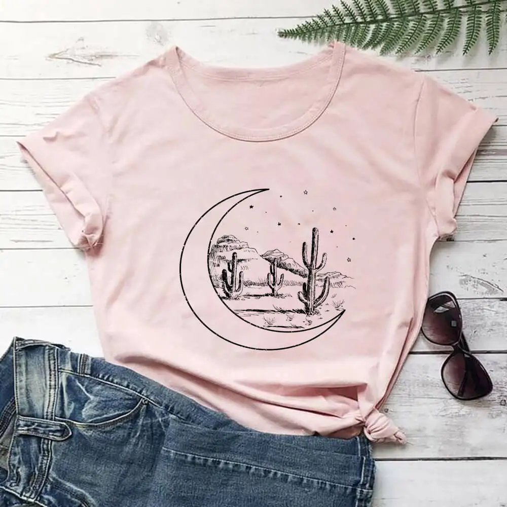 Луна, пустыня, кактус, задний пейзаж, принт 100%, стиль унисекс, забавный летний Повседневный Топ с коротким рукавом, футболка Eco Life