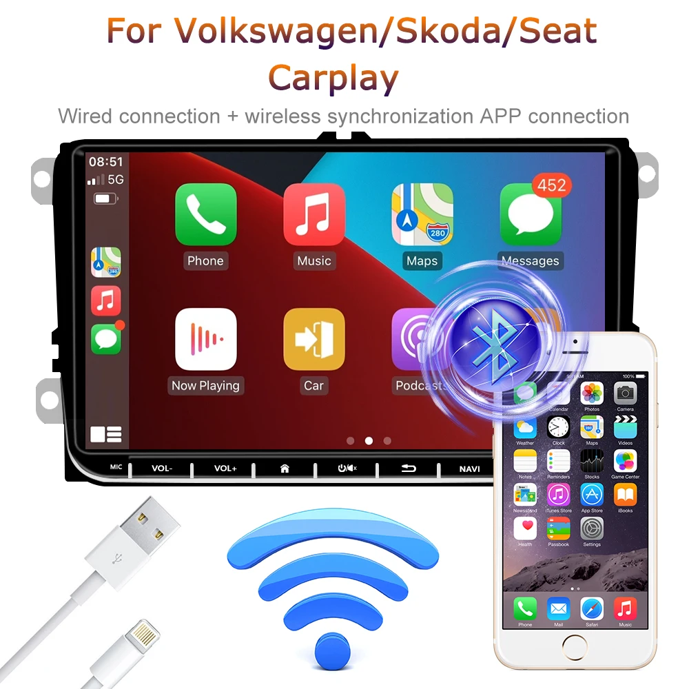 Оригинальное заводское стильное автомобильное радио для VW Passat Golf MK5 MK6 Jetta T5 EOS POLO Touran Seat Sharan CANBUS в комплекте 2 DIN 9 дюймов TFT ёмкостный Тач-Экран. Система Android 10,0 Супер высокое разрешение с 1024x600 пикселей 1,2G четырехъядерный процессор с 1G DDR3 Встроенная флэш-память 16G для музыки/навигационной карты/видео Fm-радио, автоматический магазин памяти/предустановленное сканирование Зеркальная ссылка для смартфона Встроенный Bluetooth 4,0 с A2DP/Hands Free/Телефонная книга 2 x Задний вход USB Встроенный gps-приемник, совместим с Waze/Navfree/Google Map и т. д. Вход задней камеры Множество настроек эквалайзера Регулятор громкости/фейдера/баланса/высоких частот/басов Совместимость мультимедийного плеера со всеми форматами 2 канальный RCA Выход 2CH задний видео вход 2CH задний RCA вход 2CH задний аудио выход Встроенный WIFI Управление рулевым колесом Беспроводная система Carplay: Беспроводная система Carplay в автомобиле может тесно интегрировать устройство iOS и iOS с системой приборной панели. Используйте rs, которые используют Carplay, можно подключить к автомобильной системе через Bluetooth для реализации голосовой навигации, совершать звонки, отправлять и получать сообщения и слушать музыку. Он доступен только для iPhoneСпецификация:Напряжение: DC12VСистема: Android 10,0Чип ЦП: zhangxunРазмер экрана: 9''Разрешение экрана: 1024*600Зеркальная связь: ПоддержкаGPS: поддержкаУсилитель мощности: AC7315HXИнтернет: WIFIФормат аудио: MP3/WMA/MP2/OGG/AAC/M4A/MA4/FLAC/APE/3GP/WAVФормат видео: Mpeg1/Mpeg2/Mpeg4/SP/ASP/GMC/XVID/H.263/H.264Формат изображения: BMP/JPG/GIF/PNGЗаводское ключевое слово: 8888Язык: китайский (традиционный)/китайский (упрощенный)/Английский/французский/немецкий/итальянский/испанский/португальский/Турецкий/арабский/Иврит/Польский/индонезийский/Чешский/Датский/Филиппинский/голландский/Греческий/украинский/индийский/тайский/японский/Корейский Посылка включает в себя:1 x VW Android плеер1 x Антенна GPS1 x Новый стиль жгута питания VW1 x Жгут питания старый стиль жгута VW1 x коробка CANBUSАдаптер радиоантенны-1 шт.2 usb-адаптера1 x вход камеры1 х RCA вход/выход1 x Руководство пользователя