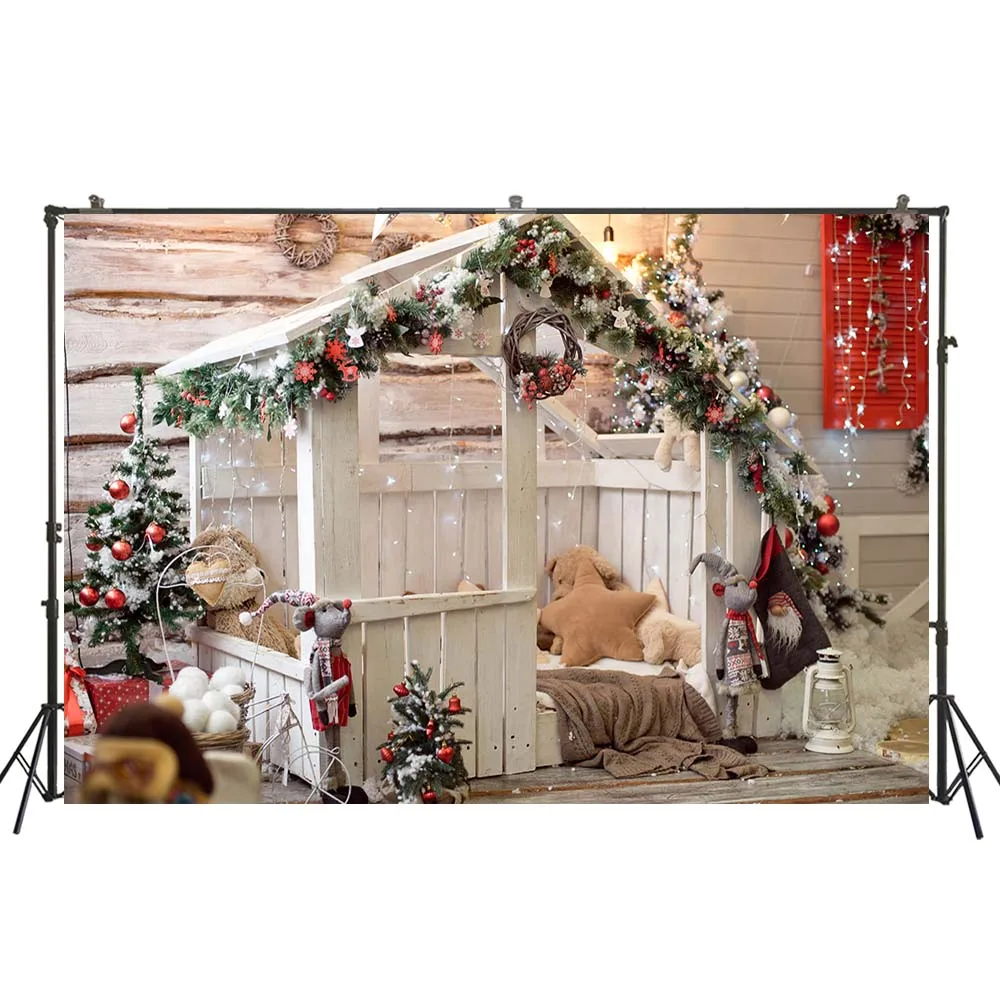 Рождественский фон деревянный дом Рождественская елка детский портрет Рождественская вечеринка Декор фото фон реквизит W-4722
