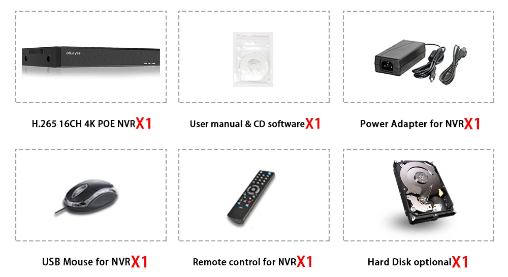 1 сетевой видеорегистратор 16CH 4K POE NVR;1 x Блок питания для NVR;1 х USB мышь для NVR;1 компакт-диск программного обеспечения для NVR;1 пульт дистанционного управления для NVR;Жесткий диск опционально!