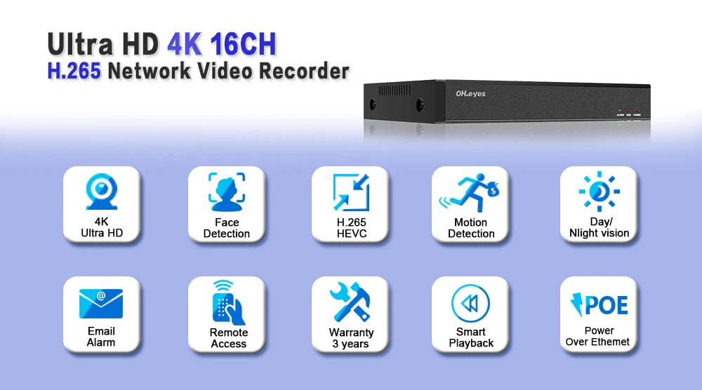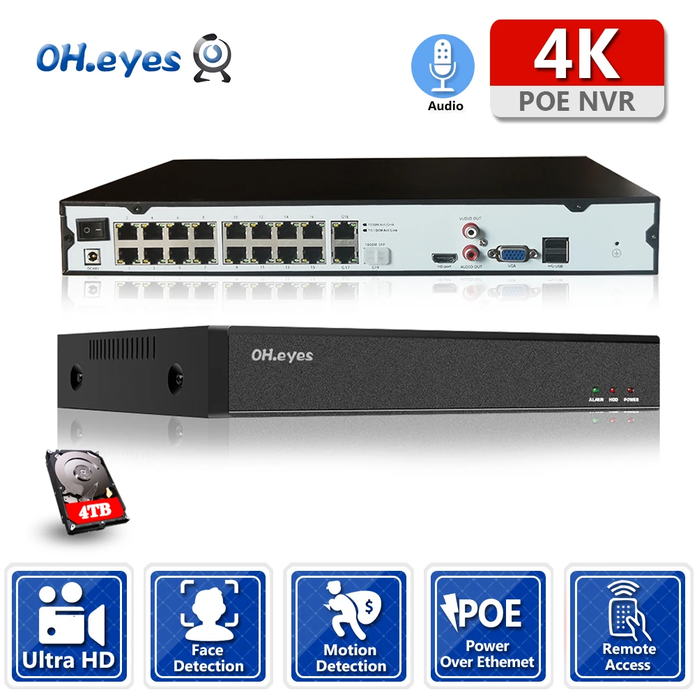 OH.eyes 4K 16-канальный NVR 48V H.265 + 16CH NVR распознавание лица/движения Поддержка RTSP с 16 портами POE для набора безопасности XMEYE App
