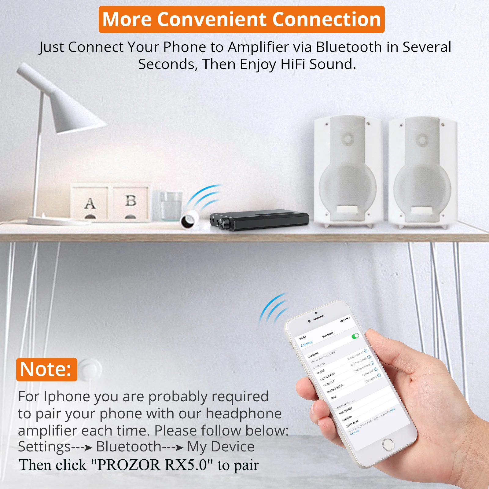 Для Iphone вам, вероятно, необходимо каждый раз связывать ваш телефон с нашим усилителем для наушников. Ниже: настройки --- Совместимость с Bluetooth --- мое устройство, затем нажмите «PROZOR RX5.0» для сопряжения.
