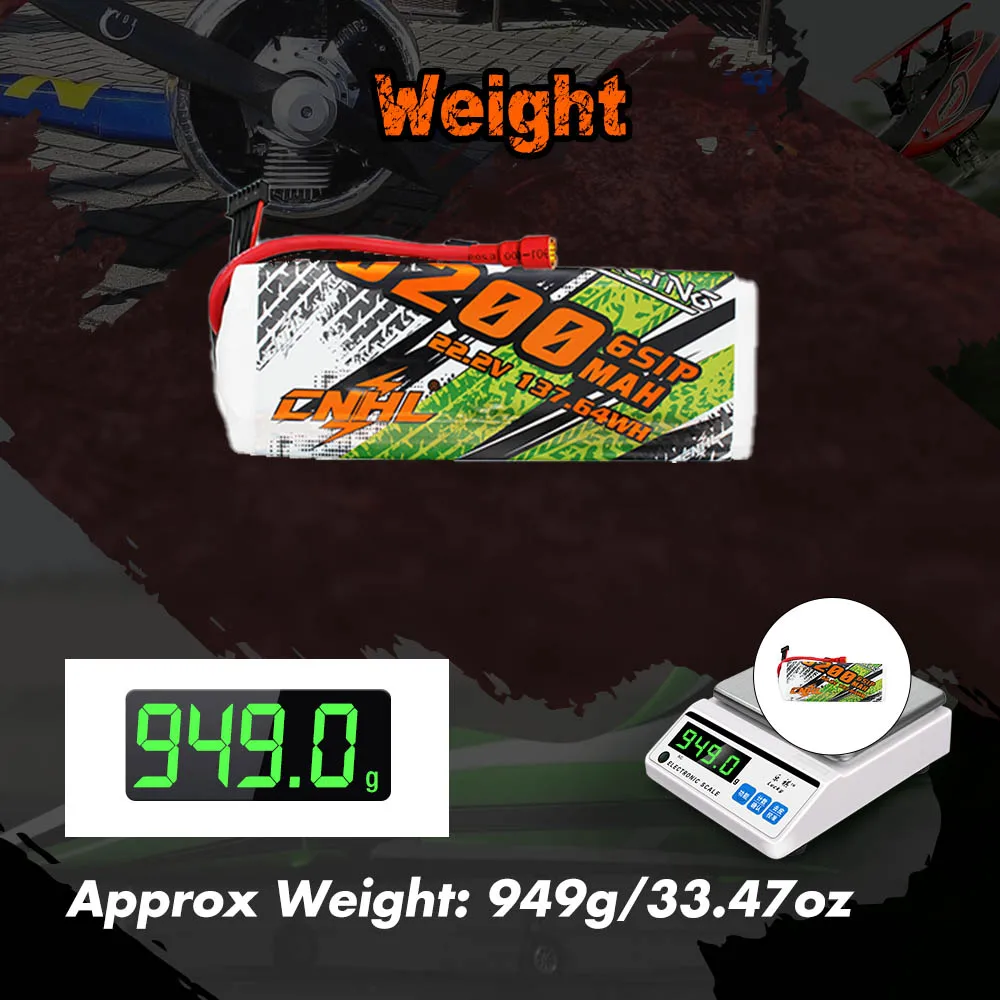 Номер склада: 620906BT80Емкость: 6200 мАчНапряжение: 22,2 в/6 ячеек/6S1PСкорость разряда: 90C непрерывный/180C BurstСкорость зарядки: 5C MaxРазмер: 60х46,8х160ммВес: 949 г (включая провод и разъем)Выходной разъем: 8 мм цилиндрическая вилкаСоединитель баланса: JST / XHПримечания: N/A
