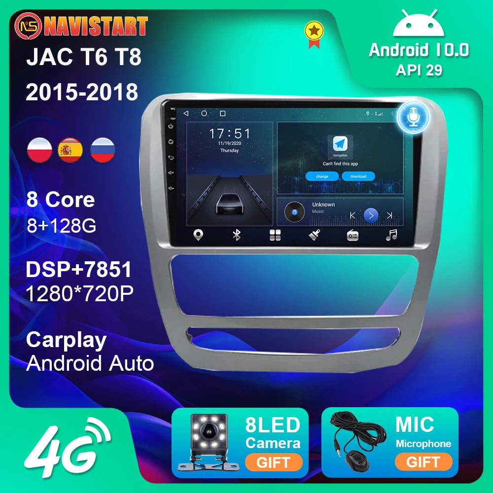 Автомобильный мультимедийный плеер 2 Din, 128G, Android 10, 4G, Wi-Fi, радио-навигация, GPS, для JAC T6 T8 2015-2018, Carplay, Wi-Fi, камера