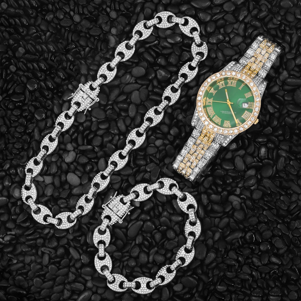 Мужские часы в стиле хип-хоп, украшенные фианитами, кофейные зерна, свинка, нос, сплав, стразы, часы + цепочка + браслет, Очаровательная цепочка, сверкающие ожерелья для мужчин, ювелирные изделия