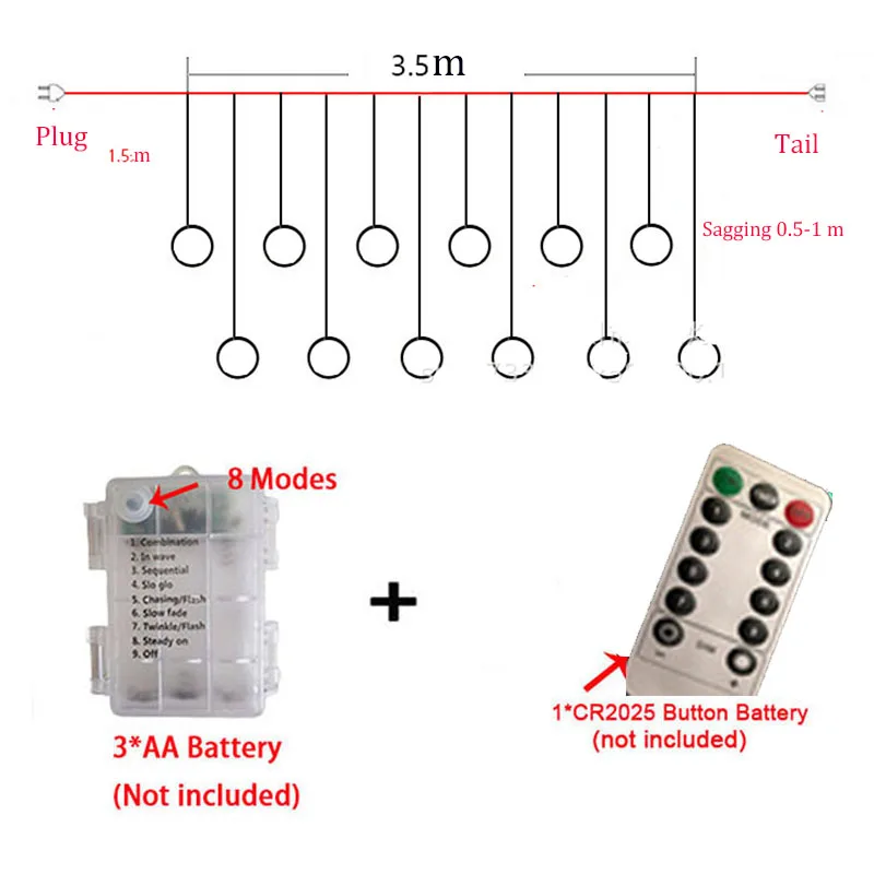 Технические характеристикиТовар: светодиодный светильник для рождественской занавескиЦвет: теплый белый, разноцветный, холодный белыйВодонепроницаемость: IP44Материал: медная проволока + пластиковая крышкаСтрока LightLength: 3,5 м Стандарт штепсельной вилки: штепсельная вилка европейского стандарта/штепсельная вилка американского стандарта 8 режимов • Питание: 1. Постоянный светильник режим 2. Режим вспышки 3. Мигающий режим 4. Непрерывный режим 5. Режим волны 6. Fantasy 7. Свое существование режим 8. Медленный режим вспышки