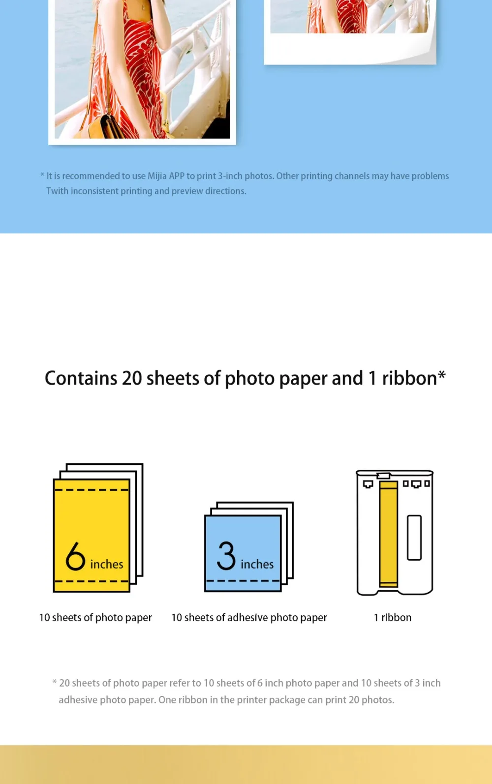 Машина посылка содержит 10 листов 6-дюймовая фотобумага 10 листов 3 дюймов фотобумага, и 1 лента