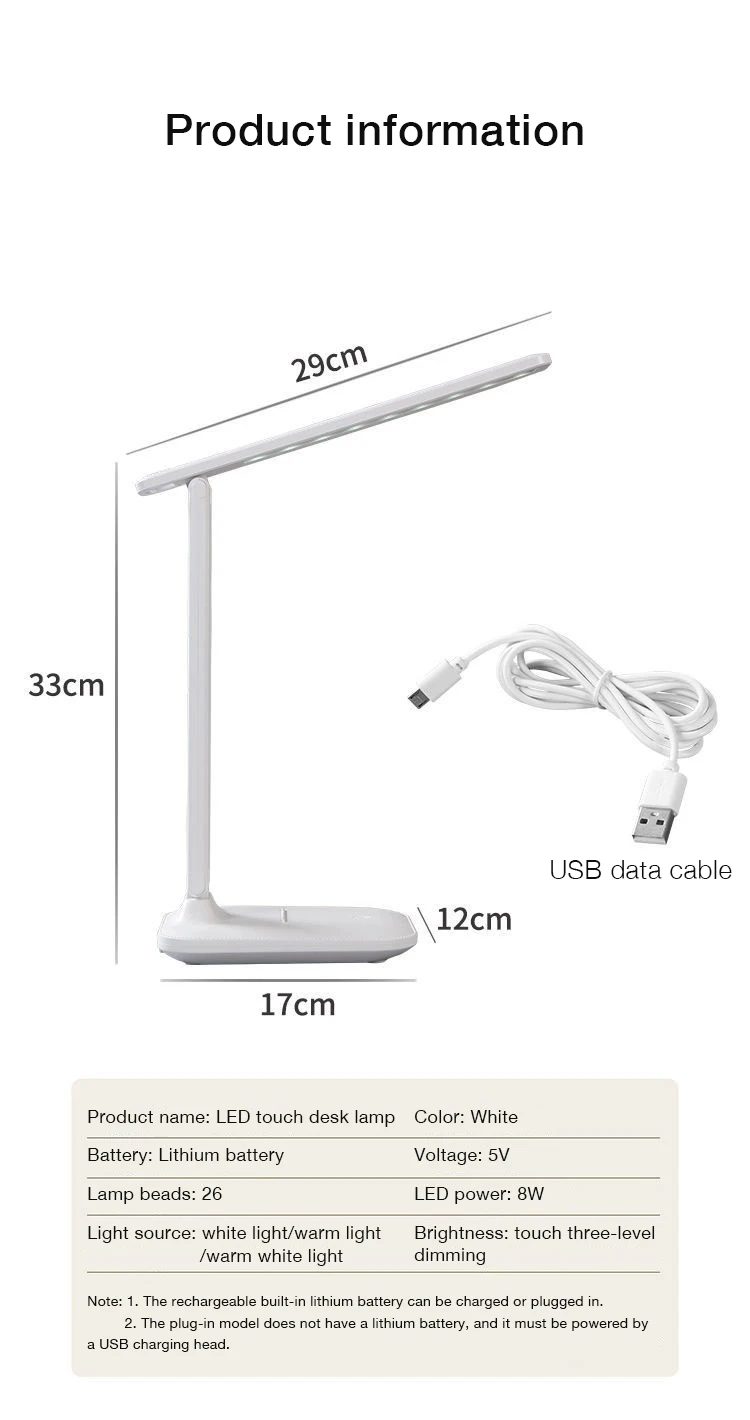 /С батареей: настольная лампа имеет литиевую батарею, которую можно заряжать. После того, как аккумулятор полностью заряжен, его не нужно подключать к источнику питания при использовании настольной лампы.