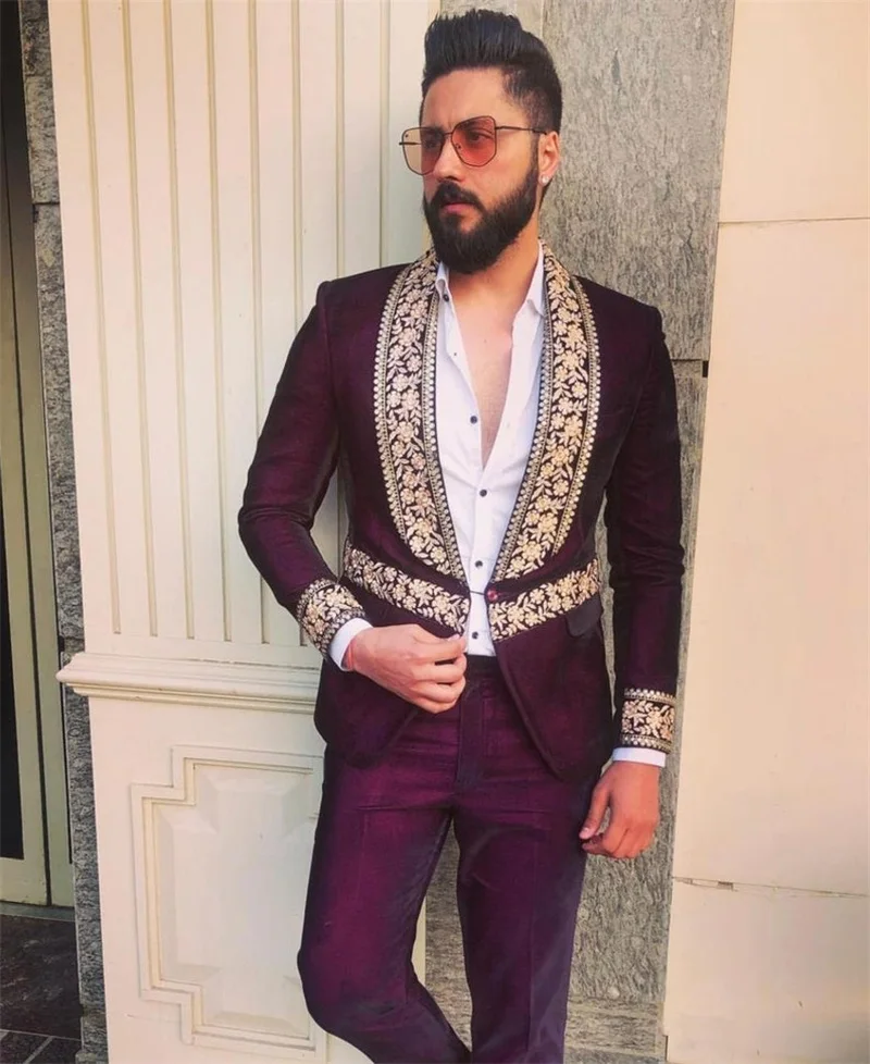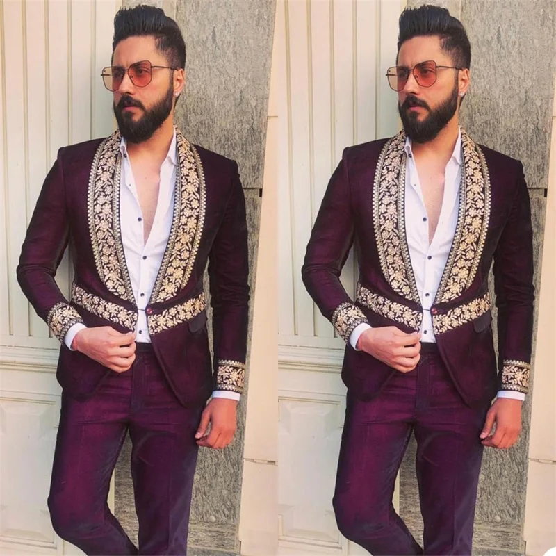 Мужские кружевные костюмы из 2 предметов с цветочным рисунком, фиолетовое пальто + брюки, индивидуальный пошив, красивые свадебные костюмы, однобортные, деловые, Роскошные, для вечеринок