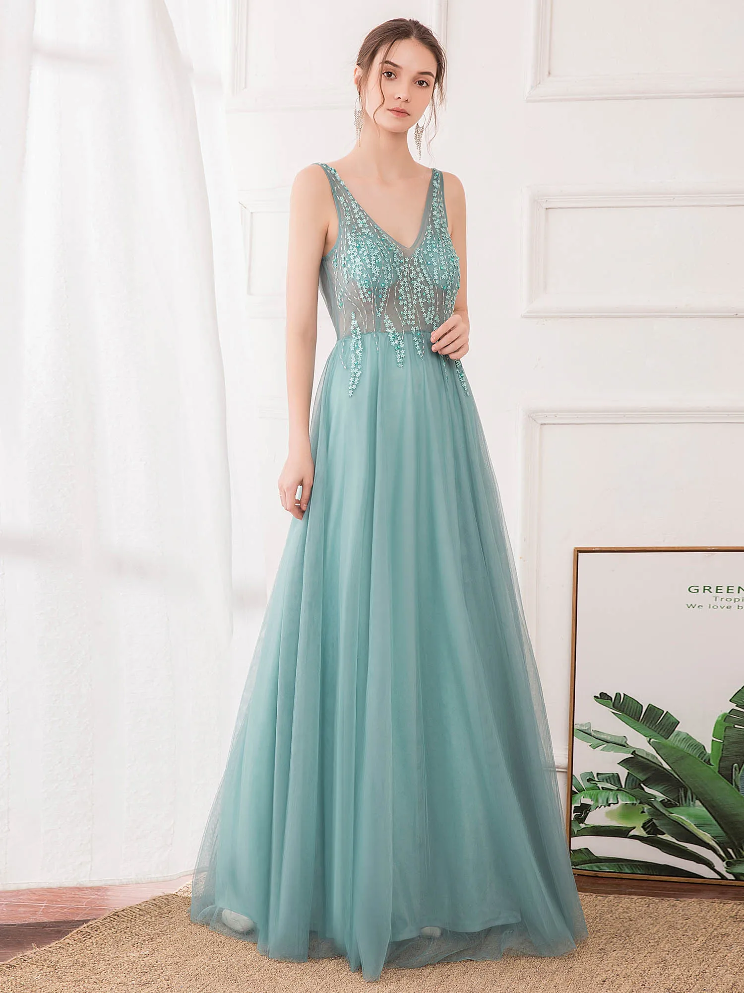 Женское вечернее платье с бусинами, роскошное ТРАПЕЦИЕВИДНОЕ ПЛАТЬЕ с двойным V-образным вырезом, платье без рукавов, ТРАПЕЦИЕВИДНОЕ ПЛАТЬЕ