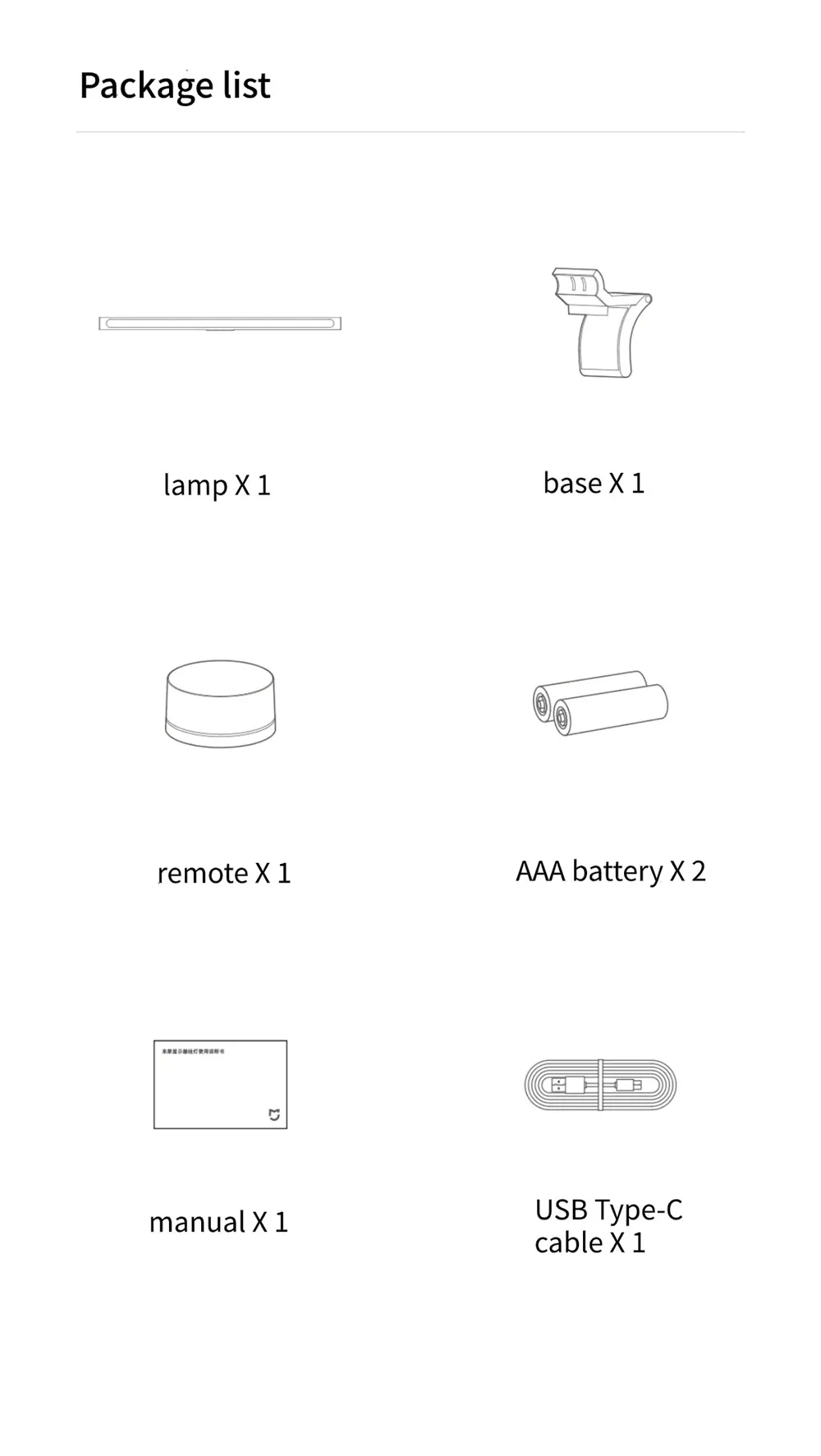 1 * Лампа1 * основание1 * пульт дистанционного управления1 * Руководство пользователя1 * кабель USB Type-C