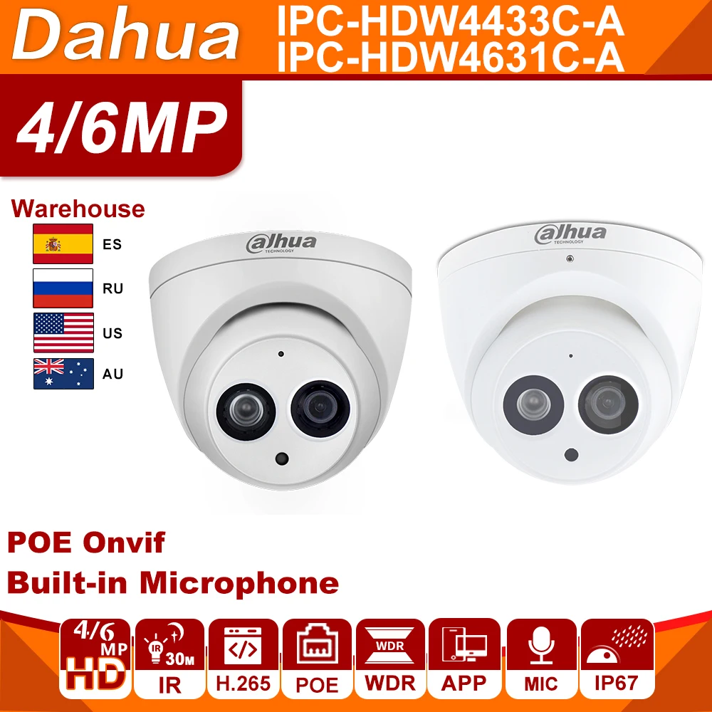 Сетевая камера Dahua IPC-HDW4433C-A, 4 МП, 6 МП, веб-камера powerby POE CCTV, встроенный микрофон IR, 30 м, 50 м, H.265