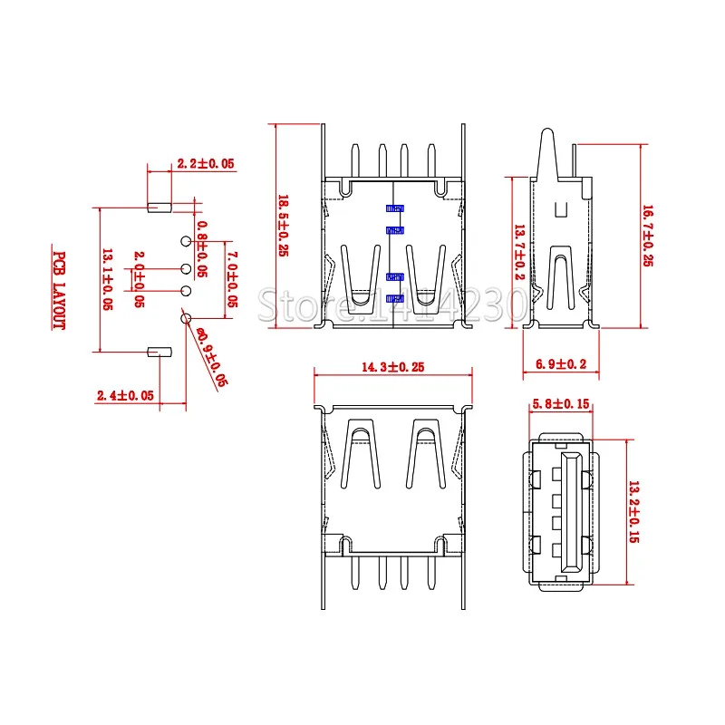 100 шт., USB тип A, гнездо 180 градусов, вертикальный 4-контактный USB-интерфейс