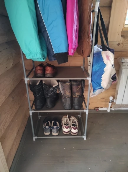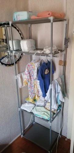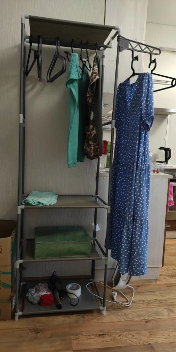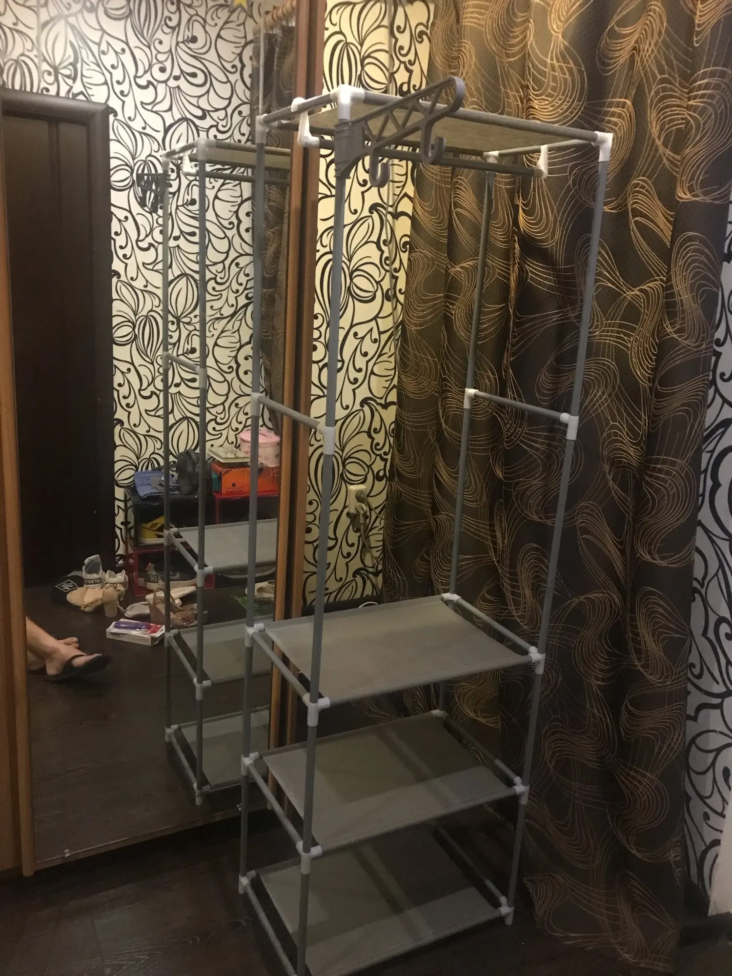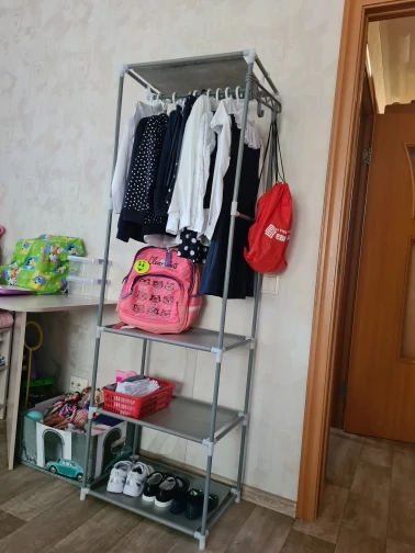 Отличная вешалка. Лёгкая в сборке, понятная инструкция в картинках. Можно по своему усмотрению менять конструкцию. Я подняла одну полку над вешалками и внизу поставила палочки длиннее, чтоб уместились корзины, мне так удобнее ♀️. Полочки из нетканного материала с пропиткой влагостойкой, можно протирать. Из дефектов увидела несколько заломов на ткани, не критично. Осталась одна деталь запасная (уголок) Экспресс доставка до Пензы 5 дней, хотя предварительно было указано 12 дней. Приобретала по акции около 500 рублей. Покупкой полностью довольна Продавца рекомендую