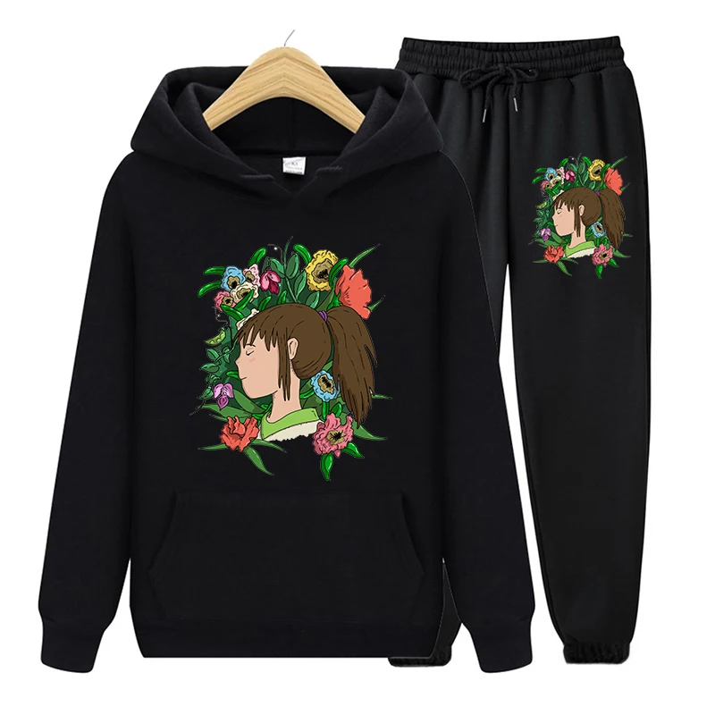Женский спортивный костюм в стиле Харадзюку, черная толстовка с капюшоном и длинные штаны