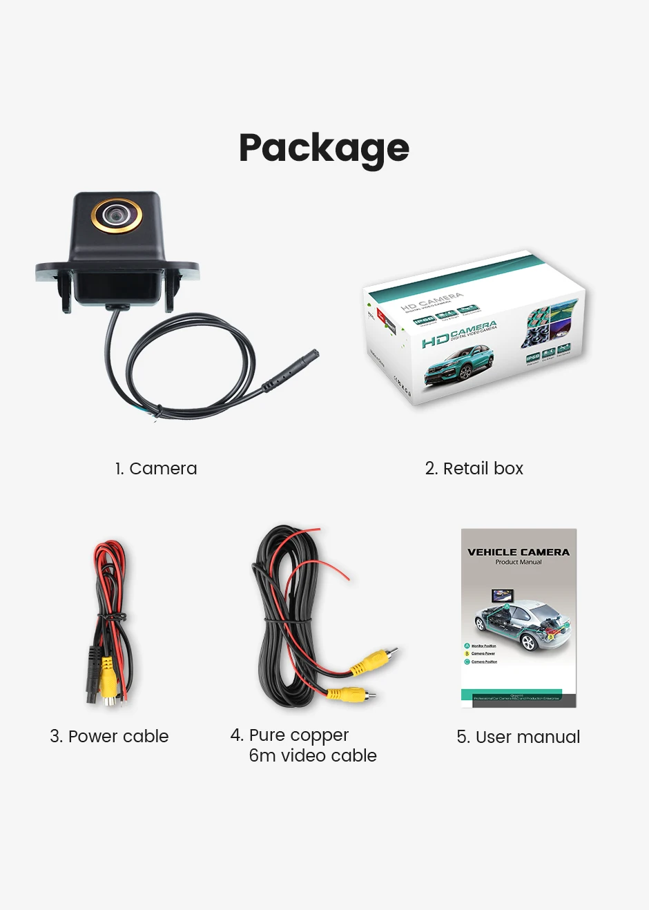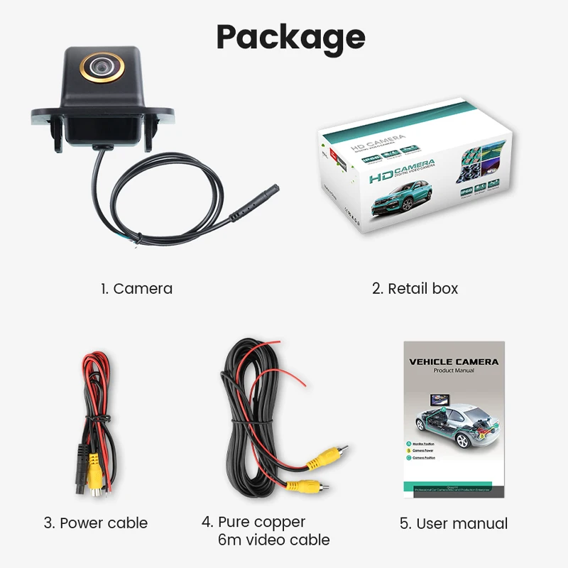 1. Камера заднего вида2. Розничная коробка3. Кабель питания4. Чистый медный 6 м видео кабель5. Руководство пользователя