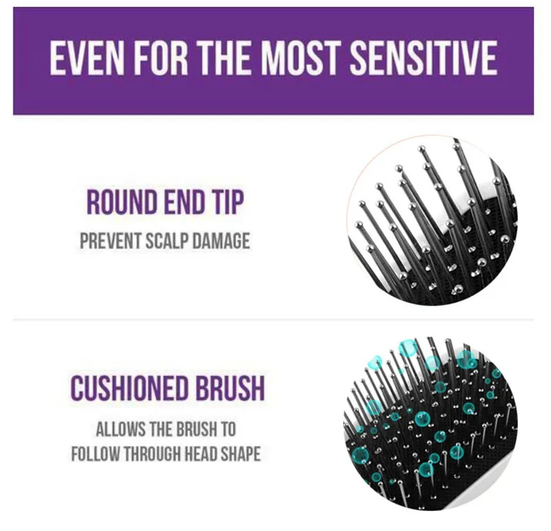 -- Щетинки из нержавеющей стали против статического скольжения через все типы волос, в то время как круглые шариковые наконечники мягко массируют кожу головы. Эргономичная Мягкая рукоятка удобно лежит в руке, обеспечивая превосходное сцепление.