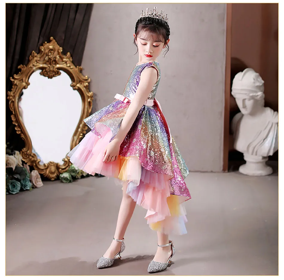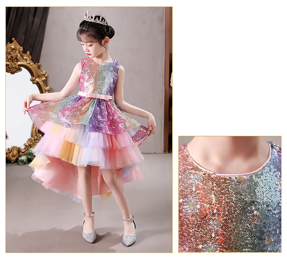 Платье с блестками для девочек, радужной расцветки, искусственное платье, детское сценическое трехслойное платье для дня рождения, свадьбы, вечеринки