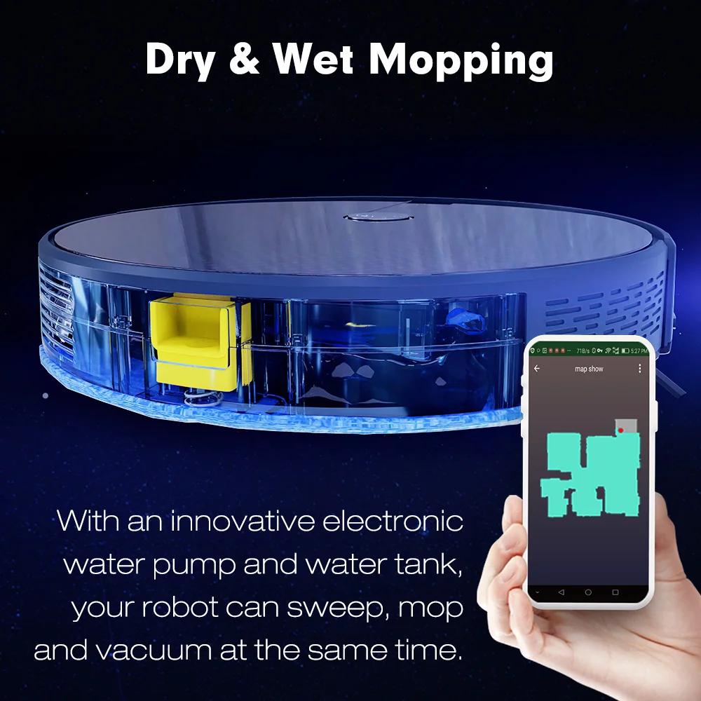 6. Электрический резервуар для воды обеспечивает даже просачивание воды. Просачивание воды автоматически останавливается, если робот перестает работать. Огромный объем воды 350 мл обеспечивает непрерывную влажную уборку до 100 минут.