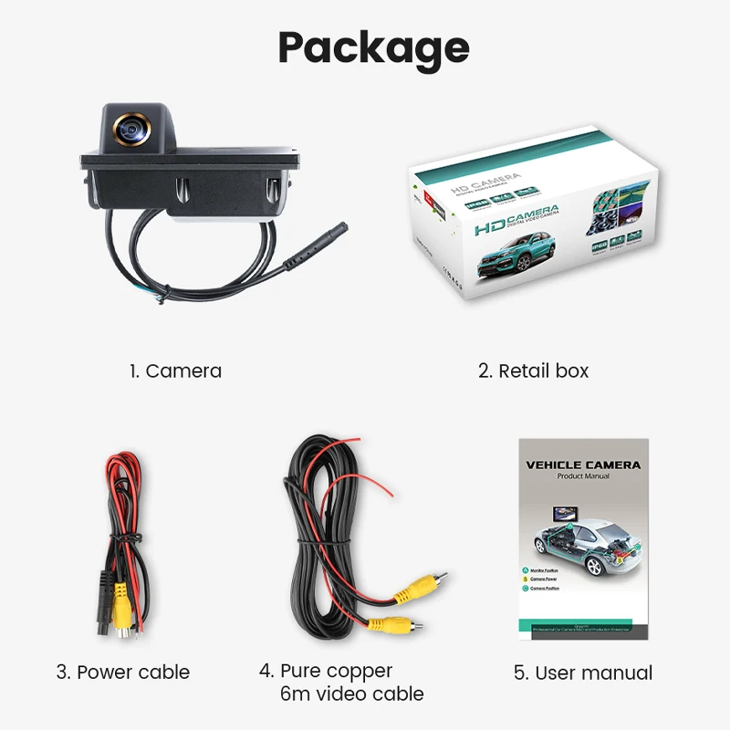 1. Камера заднего вида2. Розничная коробка3. Кабель питания4. Чистый медный 6 м видео кабель5. Руководство пользователя