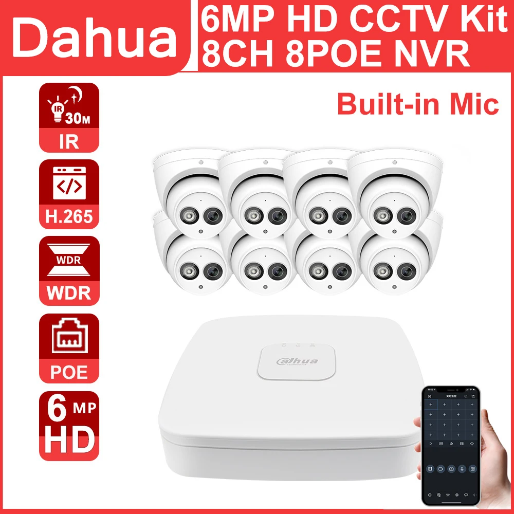 Комплект видеонаблюдения Dahua, 8-канальный сетевой видеорегистратор с питанием по Ethernet, сетевой видеорегистратор с питанием по 4 каналам, HD, 6 МП, рандомная работа, приложение для обнаружения движения, P2P, со встроенным микрофоном