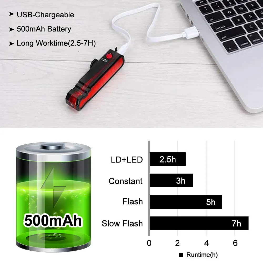 Товар: USB велосипедный лазерный задний фонарьМатериал: АБС-пластик высокого качестваСветодиодный: 5 шт. светодиодный sLD: 1 шт. LD (лазер)Яркость: 150 люменРазмер: 95*28*23 ммБатарея: встроенный 3,7 V 500mAh литиевый Электрический аккумурятор БатареяРабочее время: с Leser и светодиодный принцип эксплуатации вместе и комфортные ощущения светильник около 2,5 часов, быстрая вспышка 5 часов, медленная вспышка, 7 часов