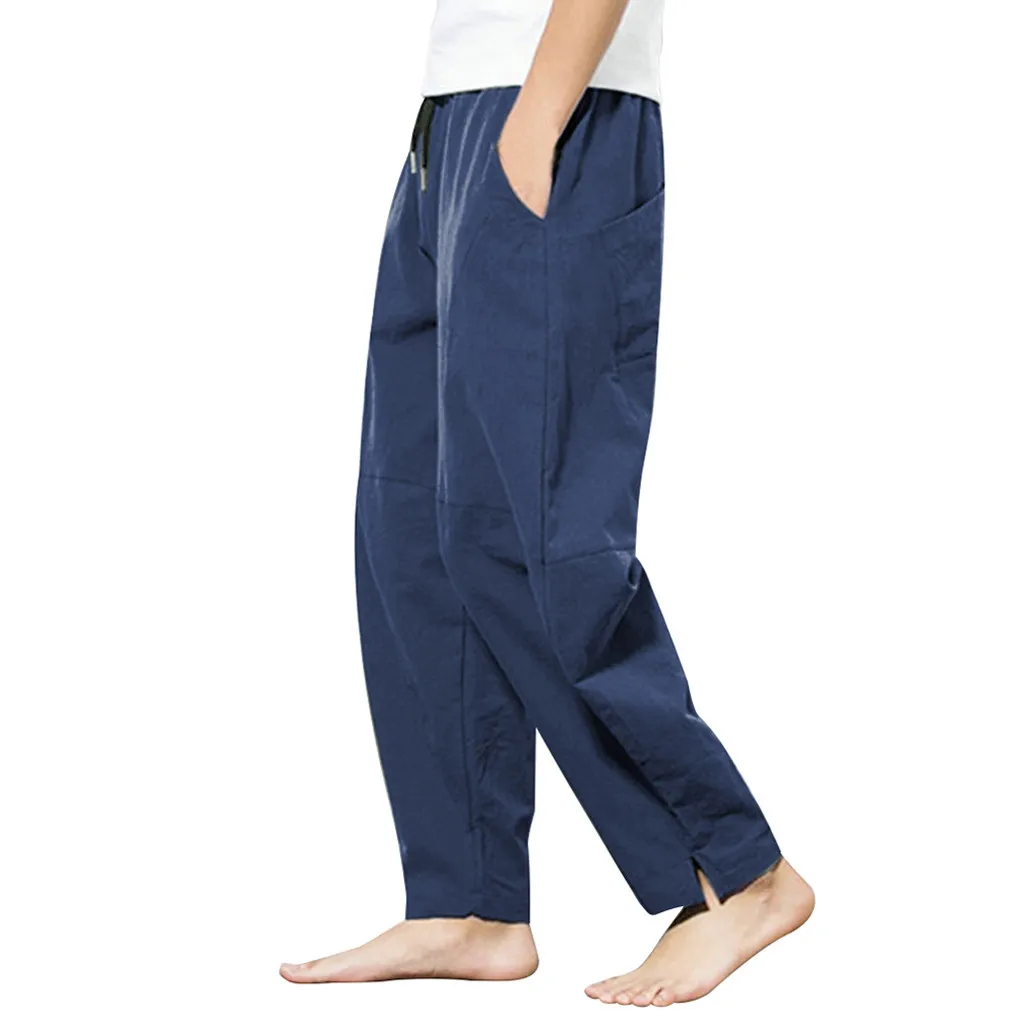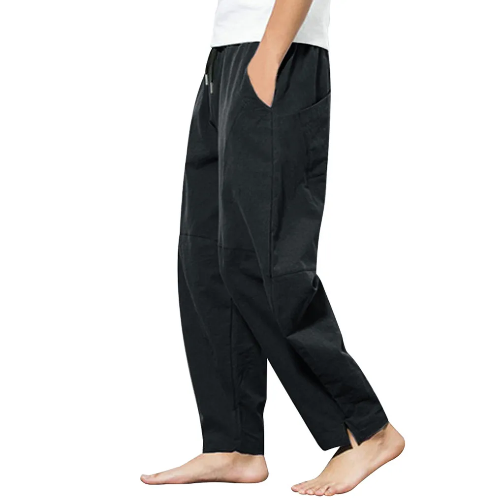 Мужские повседневные Модные свободные брюки из хлопка и льна, однотонные удобные длинные брюки с карманами, прямые брюки полной длины со средней талией на шнуровке