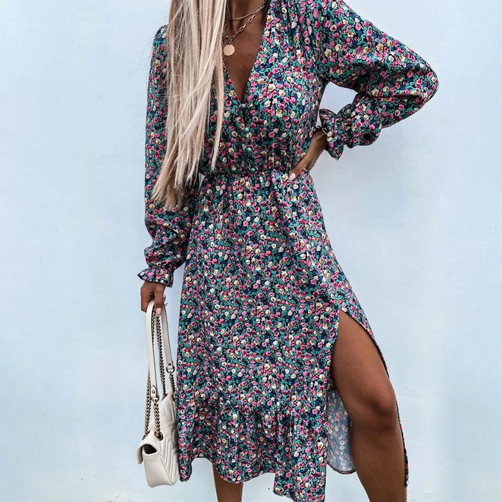 Платье женское длинное с V-образным вырезом, элегантное приталенное вечернее с коротким рукавом, на пуговицах, с Боковым Разрезом, с цветочным принтом, на лето