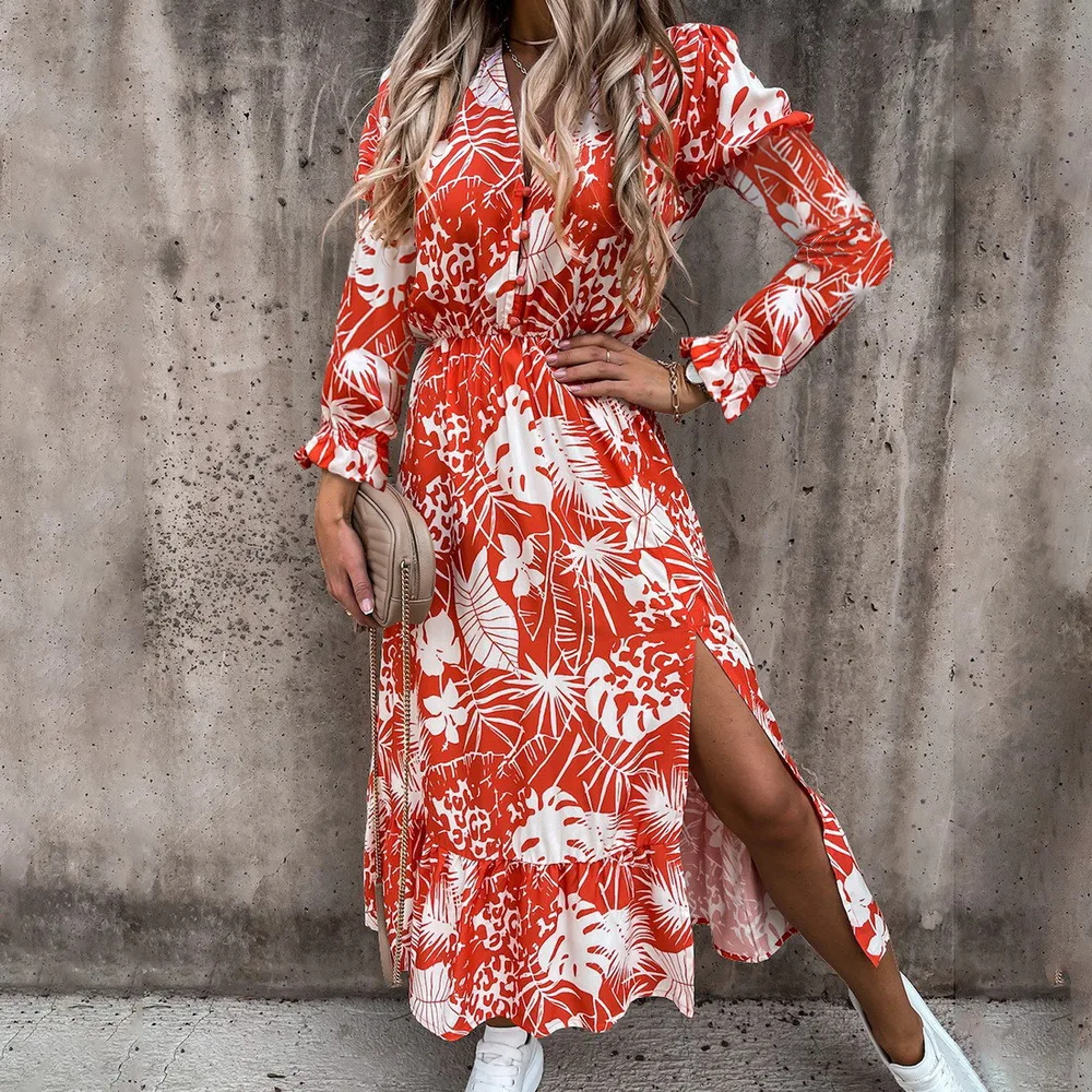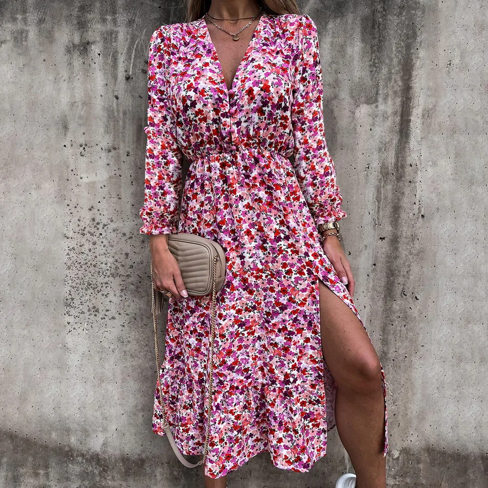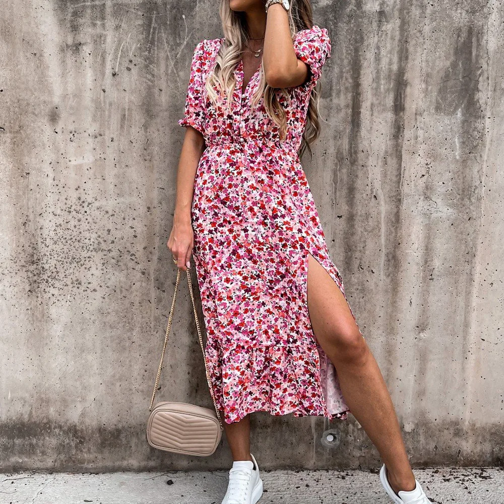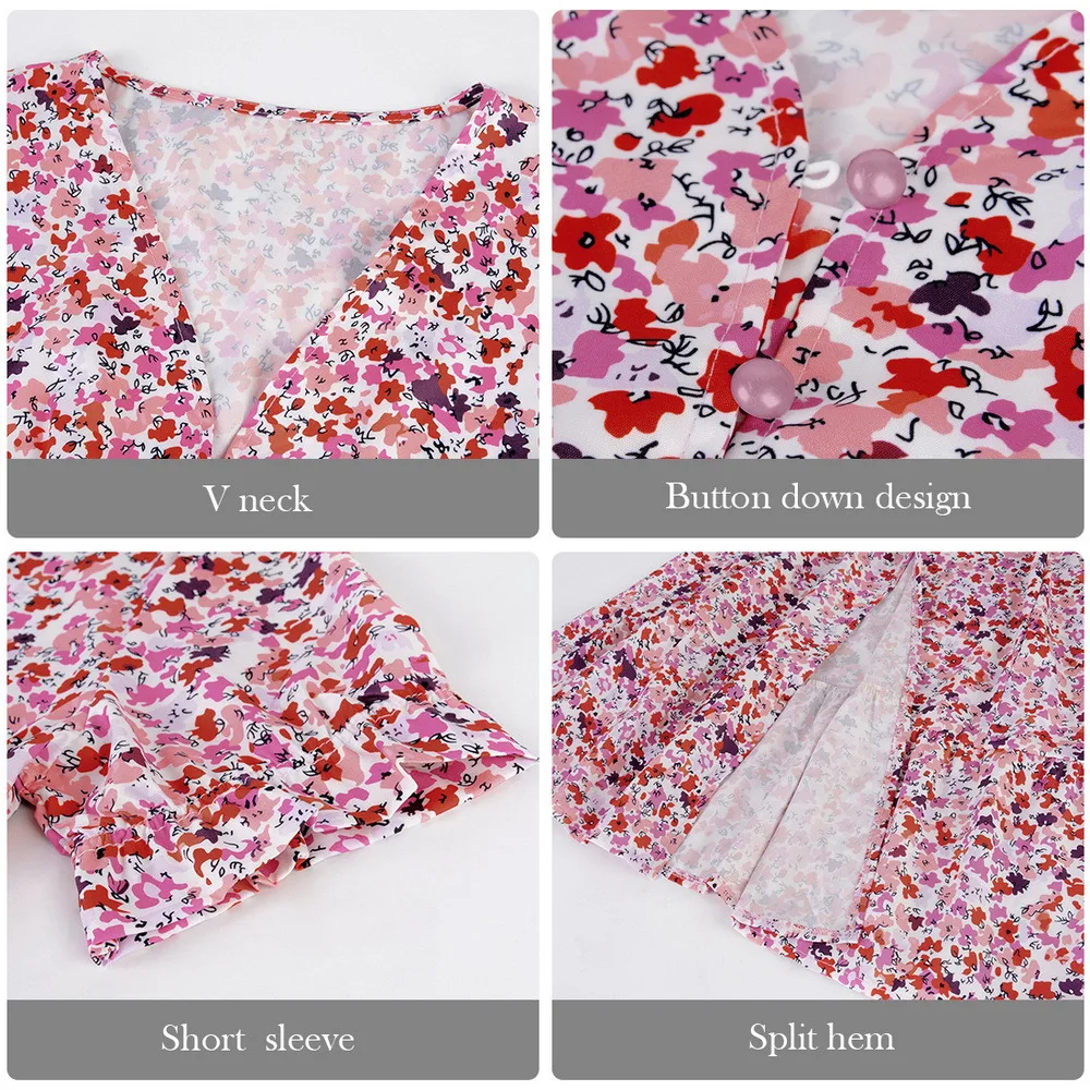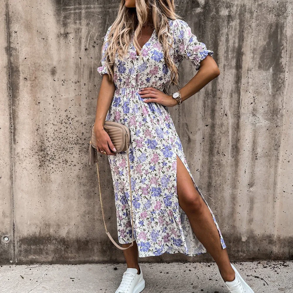 Женское длинное платье с V-образным вырезом, элегантное вечернее платье-трапеция макси с коротким рукавом и цветочным принтом, с разрезом, на пуговицах, весна-лето 2022