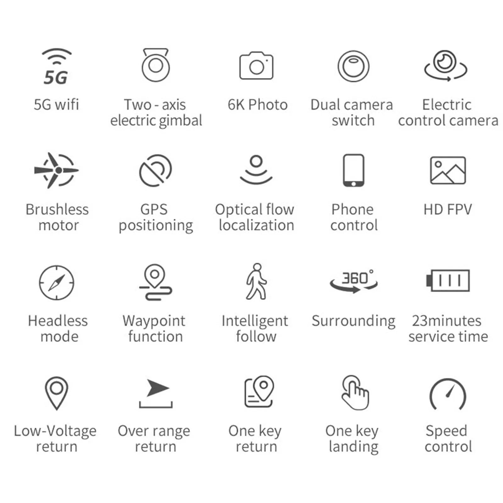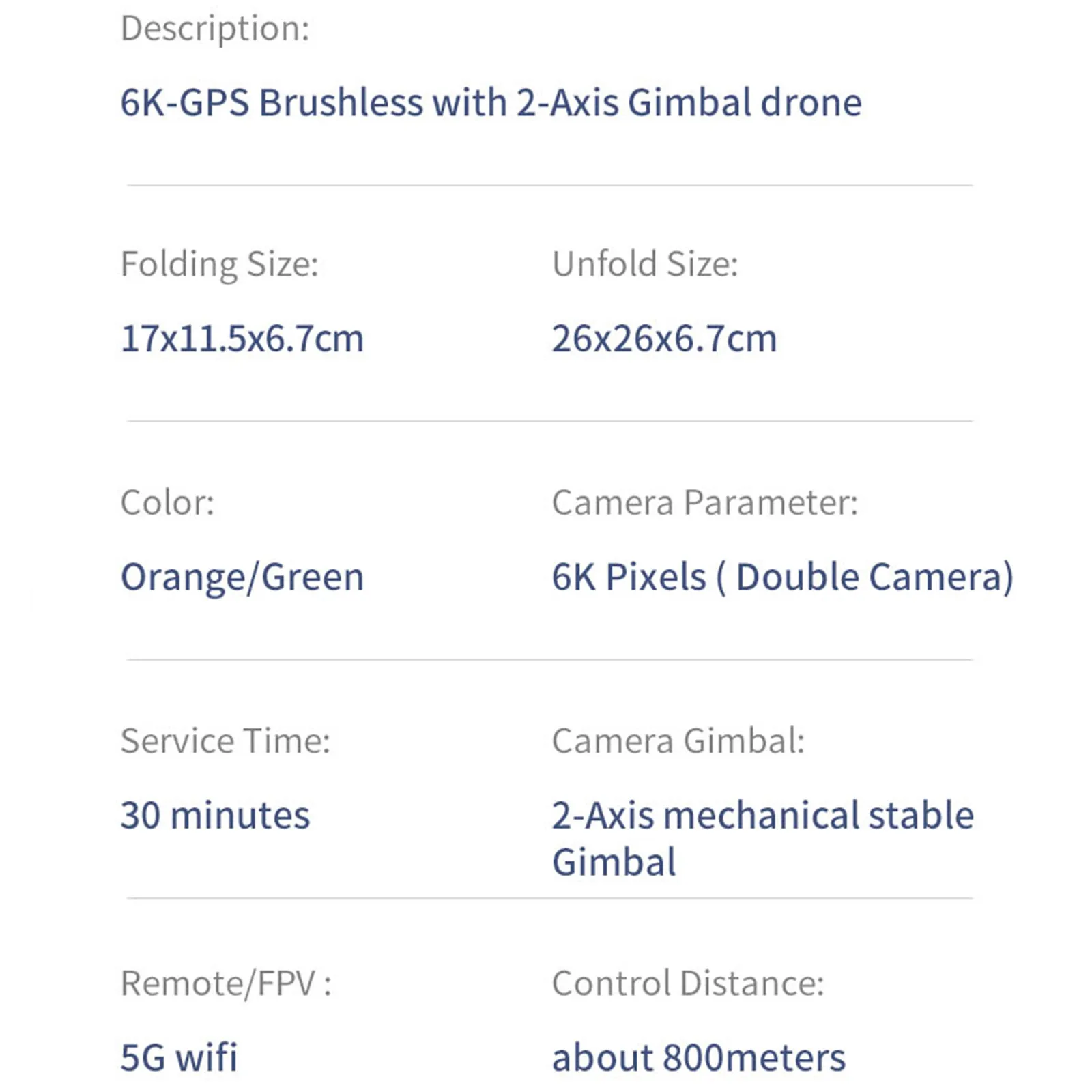 Продукт Категория: Радиоуправляемый Дрон Безопасный Полет: различные безопасные режимы защиты полета, такие как возврат низкой мощности, потеря Возврат соединения и потеря контроля возврата для обеспечения безопасности полета; Несколько Режимы полета: фиксированная высота, фиксированная точка, следовать, окружать, указывать, Траектория и другие интеллектуальные режимы полета могут удовлетворить потребности Различные варианты; HD камера: Можно снимать6KHD фотографии или 1080P видео. Делайте снимки во время полета, Получение необычных работ с разных точек зрения и сложностей; Стабилизатор: двухосный механический стабилизатор может быть Крепится Для получения стабильного во время полета, четких видео и фотографий. Бесплатно Состав: через пульт дистанционного управления или приложение, отрегулируйте Наклон Камеры Угол (90o) в любое время, чтобы получить лучший состав; Слева и Переключение правой руки, гравитационное определение, функция сопряжения, обмен и другие Функции; Зум объектива: Фокусировка быстрее и точнее,Free-zeПрекрасный момент.Спецификация: