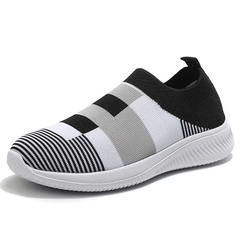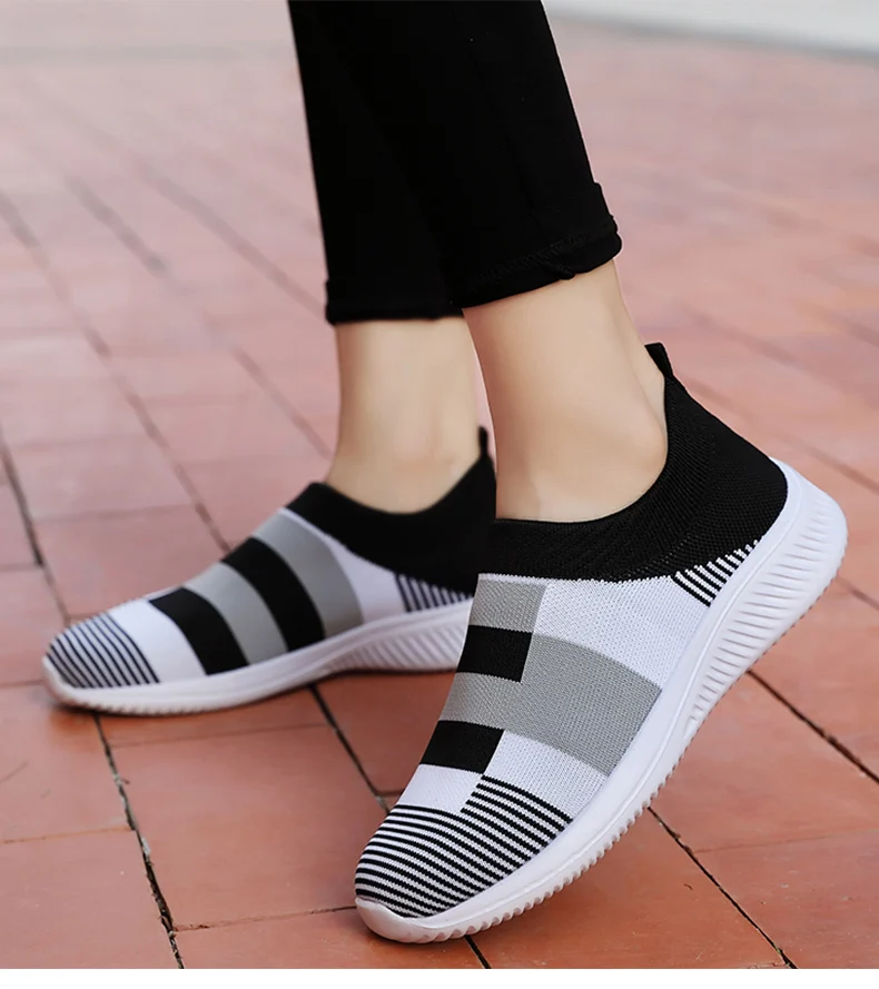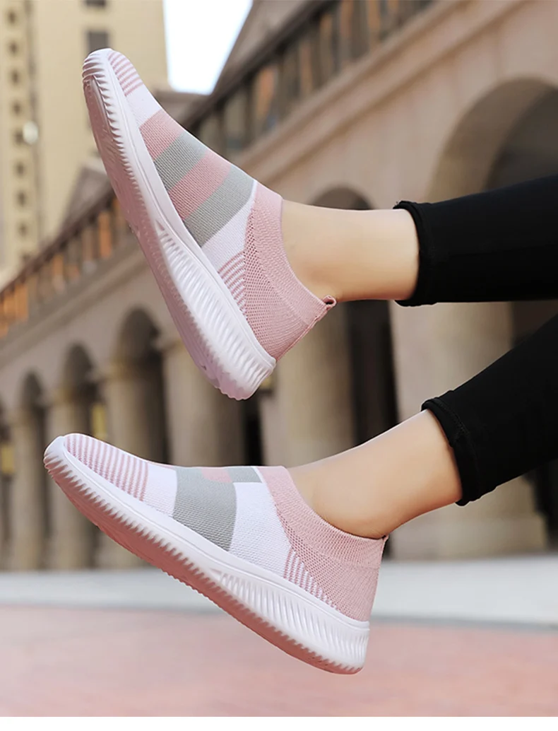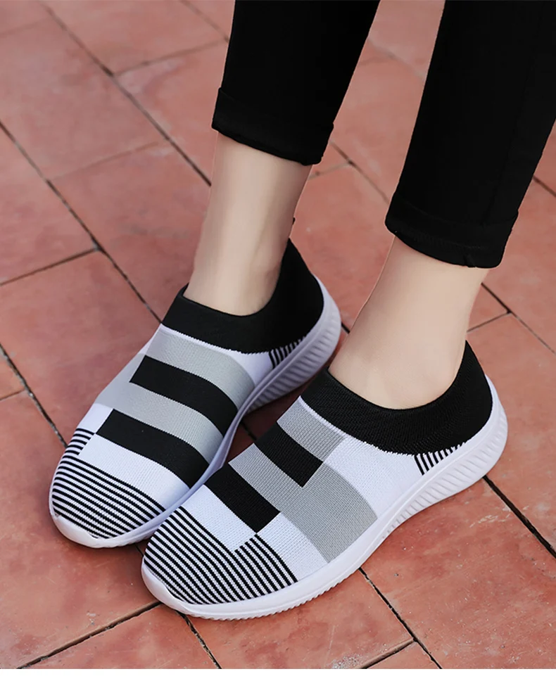 Женские разноцветные вязаные кроссовки на плоской подошве, женская обувь без шнуровки на плоской подошве, женская повседневная обувь больших размеров для лета и осени