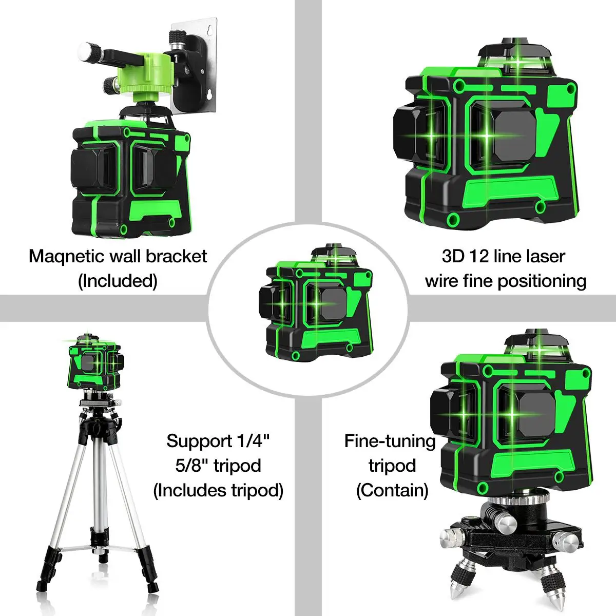 Посылка включает в себя:1 x лазерный уровеньЗарядное устройство-1 шт.1 x Аккумулятор с цифровым дисплеем1 х настенная подставка (опция)1 основание (опция)1 x Штатив 1 м (опция)Руководство пользователя на английском языке-1 шт.1 х коробка для храненияОсобенности:-Цифровой дисплей.-3D 12 линейный лазерный провод для точного позиционирования.-Самонивелирующаяся система.-Гибкость и стабильность.-Использование зарядки.-Вращающееся на 360 ° основание с тонкой ручкой настройки, быстро идентифицирует цель.-Водонепроницаемость, износостойкость и изысканность, простота в эксплуатации.-Утолщенное основание обеспечивает стабильную поддержку и ударопрочность, ударопрочность.-Легко носить с собой чехол, обеспечивая быструю и удобную мобильность и хранение.-Широкое применение для вспомогательной фиксации плитки, украшения стен, фиксации напольной плитки, лестничных поручней и многого другого.Характеристики:-Разъем питания: штепсельная вилка США, штепсельная вилка европейского стандарта (опционально)-Мощность: 100-240 В переменного тока зарядное устройство-Светильник зеленого цвета-Лазерный светильник: 360 ° x3, 12 линий-Лазерный светильник источник: длина волны лазера 532nm-Горизонтальная/Вертикальная Точность: ± 0,2 мм/1 м-Диапазон автоматического выравнивания: ± 3 °-Рабочий диапазон: около 30 м в диаметре-Рабочая температура: -10 ℃ ~ 40 ℃-Температура хранения: -20 ~ 70 ℃-Размер штатива Skrew: 1/4 ", 5/8"-Непрерывное время работы: 3-9 часов