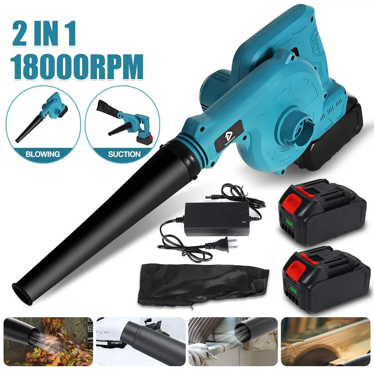 Характеристики:-Цвет: синий-Вход: 110 В/220 В ~ 0.5A-Количество батарей (опция): 1 шт., 2 шт.-Вилка (опция): штепсельная вилка США, штепсельная вилка европейского стандарта-Для литий-ионной батареи Makita 18V-Мощность: 1200 Вт-Емкость аккумулятора: 15000 мАч-Объем воздуха: 10 (куб./мин)-Давление ветра (водяной столб): 100 (кПа)-Скорость вращения: 0-18000 (об/мин)-Размер: 50x7.5x21.5 см/19.7x3x8.5 дюймов