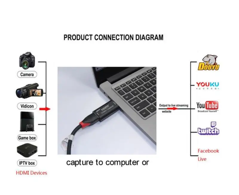 Описание:Название продукта: USB2.0 HDMI карта сбораРазрешение: 1080pИнтерфейс: HDMIРазрешение HDMI: до 4K входВидео Формат ввода: 8 / 10 / 12 бит глубина цветаРежим видеовыхода: YUV, JPEGРазрешение видеовыхода: 1080pПоддержка аудиоформата для l-pcmДлина входного кабеля: 15 м, стандартный кабель awg26 HDMIМаксимальный рабочий ток: 0.4a/5vdcДиапазон рабочих температур (от-10 до + 55 ℃)Размеры: 64x28x13 (мм)Вес: 21,4 гВведение продукта:Эта карта захвата USB 2,0 может одновременно записывать видео HDMI и аудио HDMI. Он может передавать аудио и видео сигналы на компьютеры и смартфоны для предварительного просмотра и хранения. Подходит для получения высокой четкости, обучения записи, медицинской визуализации и т. д.Особенности продукта:* Поддержка максимального входного разрешения до 4K;* Максимальное выходное разрешение-1080p;* Поддержка 8/10/12 бит глубина цвета;* Поддержка использования стандартного кабеля awg26, Расстояние входной передачи до 15 метров, (разрешение 1080p и ниже);* Поддержка большинства программного обеспечения для приобретения, таких как VLC, OBS, amcap и т. д.;* Поддержка windows, Android и MacOS;* Он Соответствует спецификации USB video UVC;* Соответствует спецификации USB аудио UAC;* Не требуется внешний источник питания, малый размер, легко носить с собой.Посылка включает в себя:1 * USB2.0 HDMI карта сбора