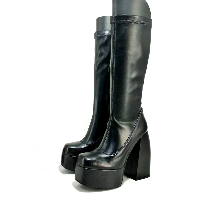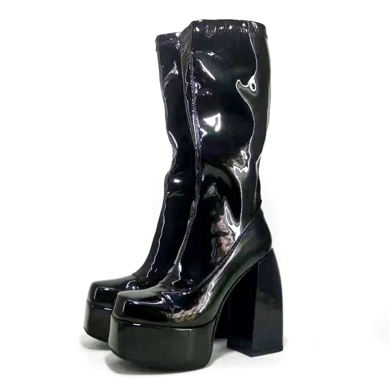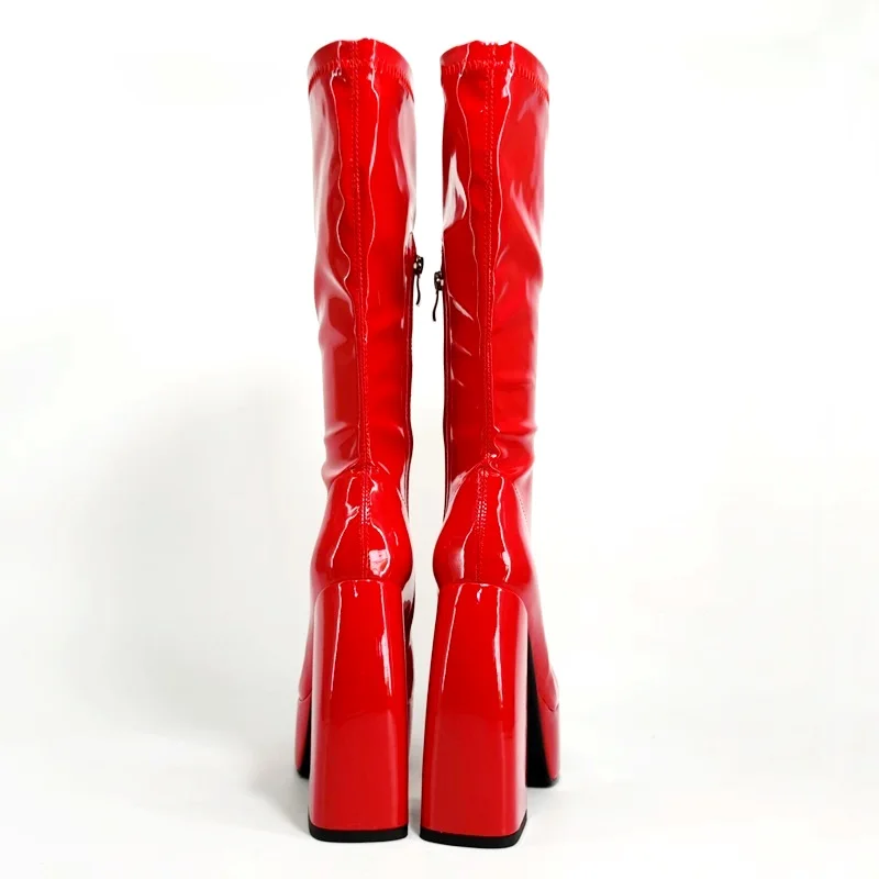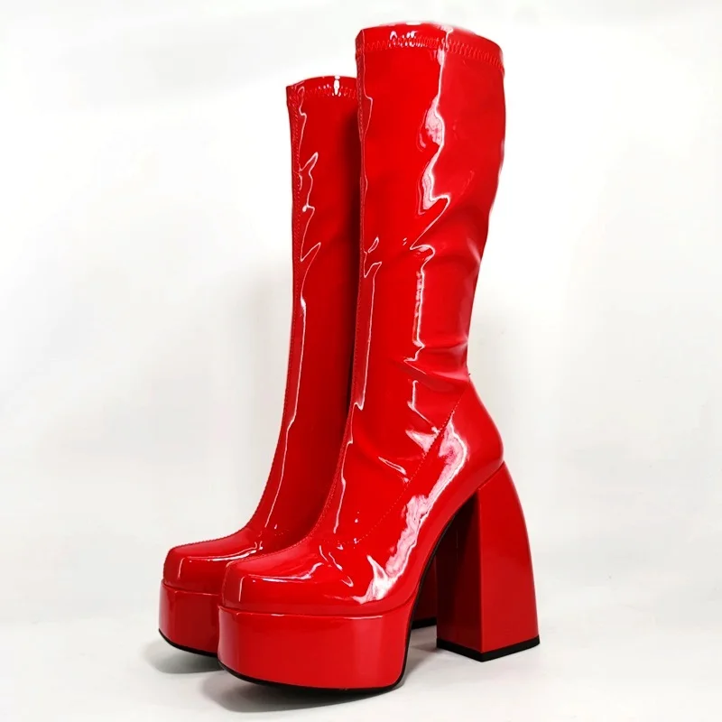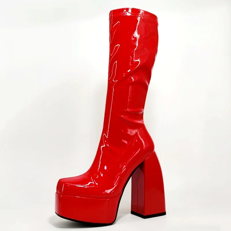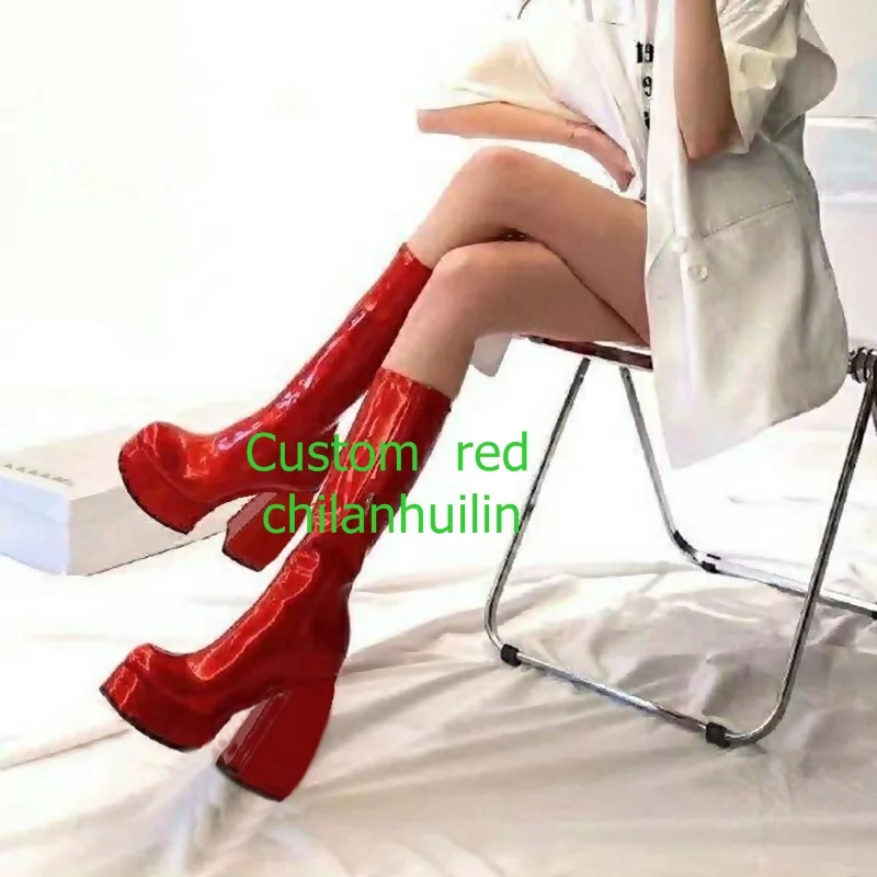 Американская Европейская популярная обувь из лакированной кожи, женские сапоги до колена, Осень-зима, высокий каблук, толстая платформа, красный цвет