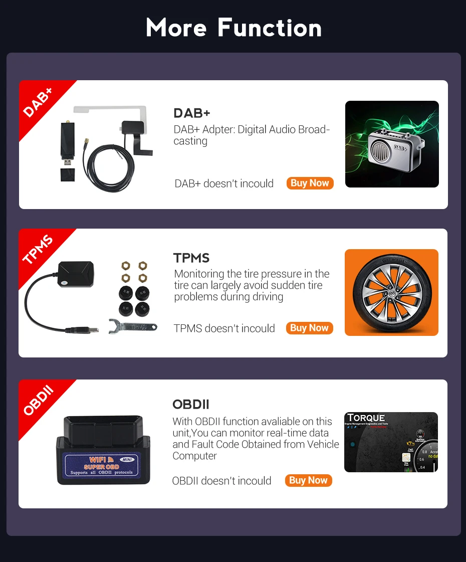 SupportOBD2 DVR DAB+ TMPS rear view camera