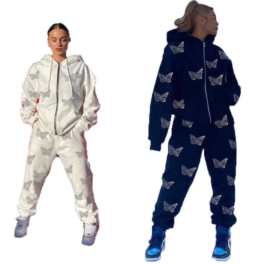Y2K модный спортивный костюм для женщин комплект из 2 предметов бабочка стразы на молнии Толстовка и штаны для бега спортивные костюмы комплект из двух предметов