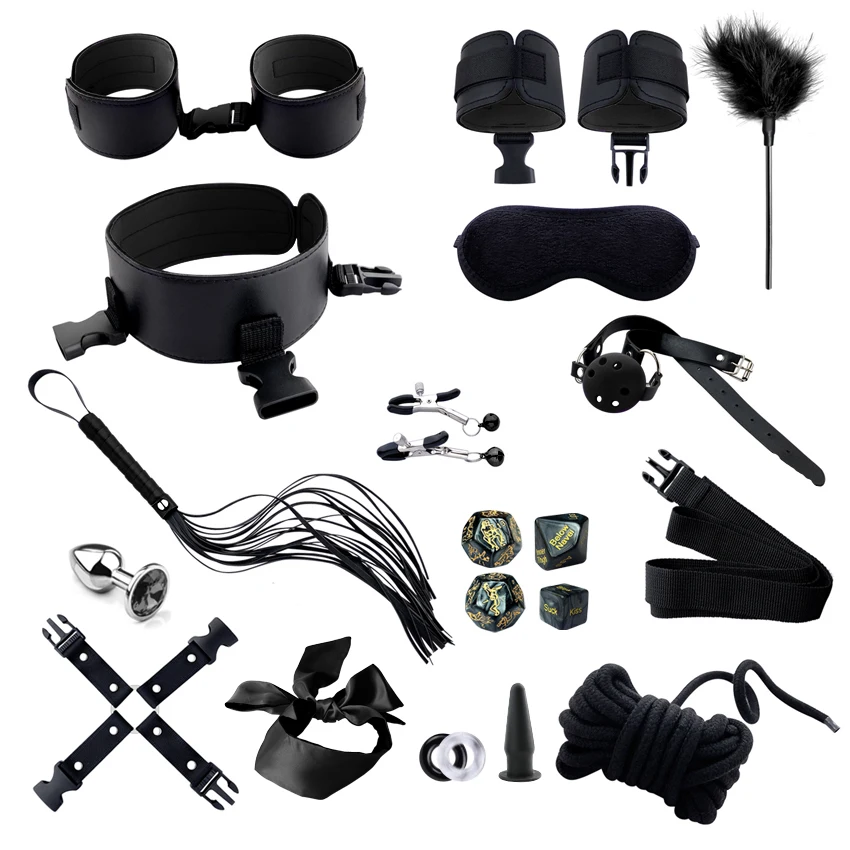 Наручники, манжеты на лодыжке, воротник, перьевая палочка, кляп, крест, анальные пробки, грудные зажимы, кожаный кнут, веревка, анальные пробки на палец, фиксирующее кольцо спермы, 4 Кубика, плюшевая маска для глаз, шелковый шарф... (как показано на картинке)