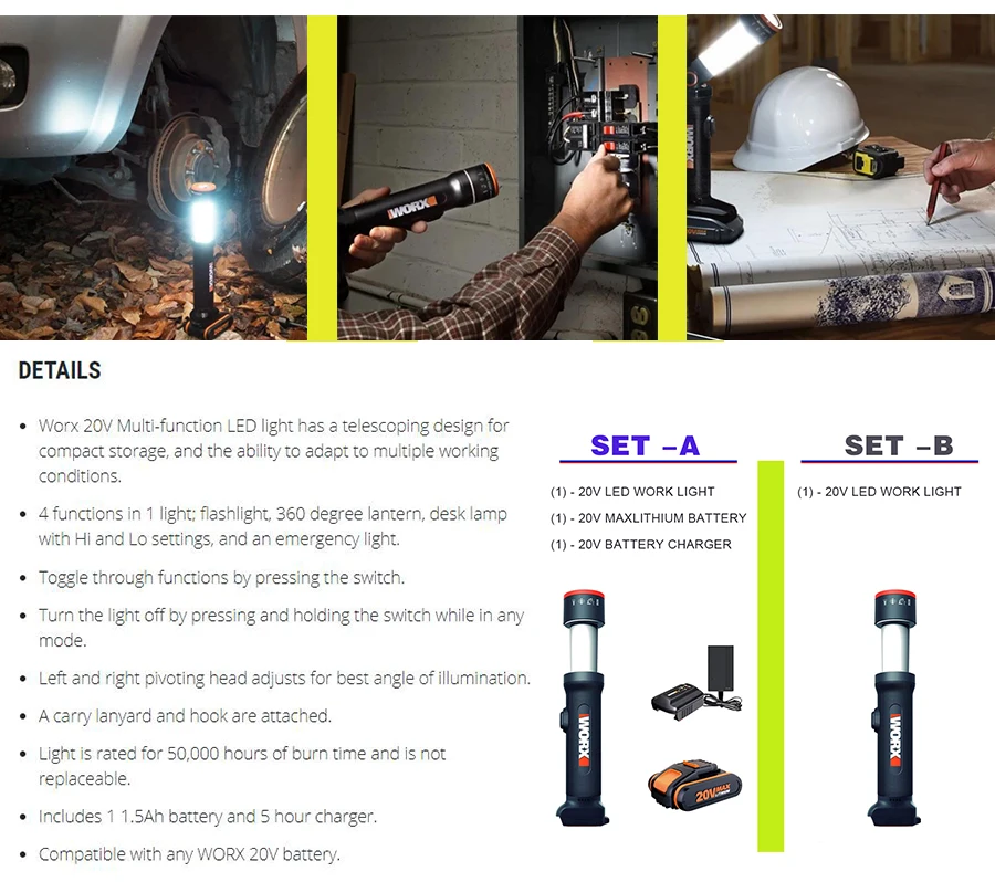 Телескопический светодиодный фонарик 20 в, Многофункциональный беспроводной портативный прожектор WORX WX027