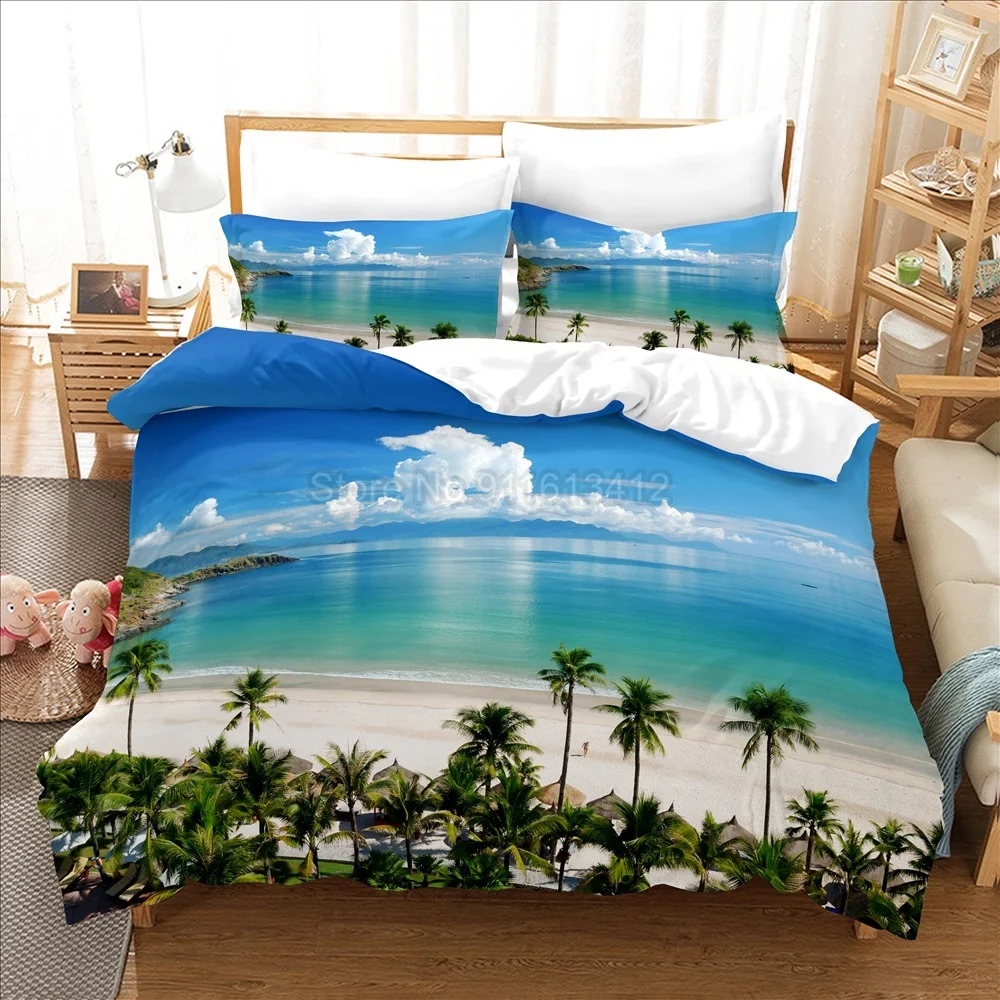 Комплект постельного белья с голубым морским песчаным пляжем, односпальное, двуспальная кровать, кокосовое дерево, пододеяльник для детской спальни