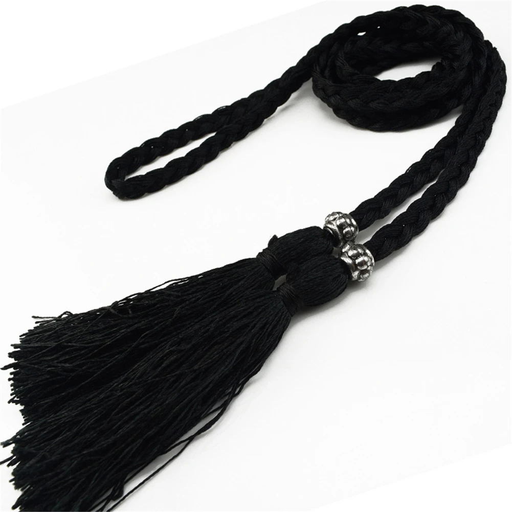 Женский Плетеный ремень в китайском стиле, тонкий плетеный ремень с кисточкой, Женский декоративный пояс с узлом, модные повседневные однотонные черные ремни