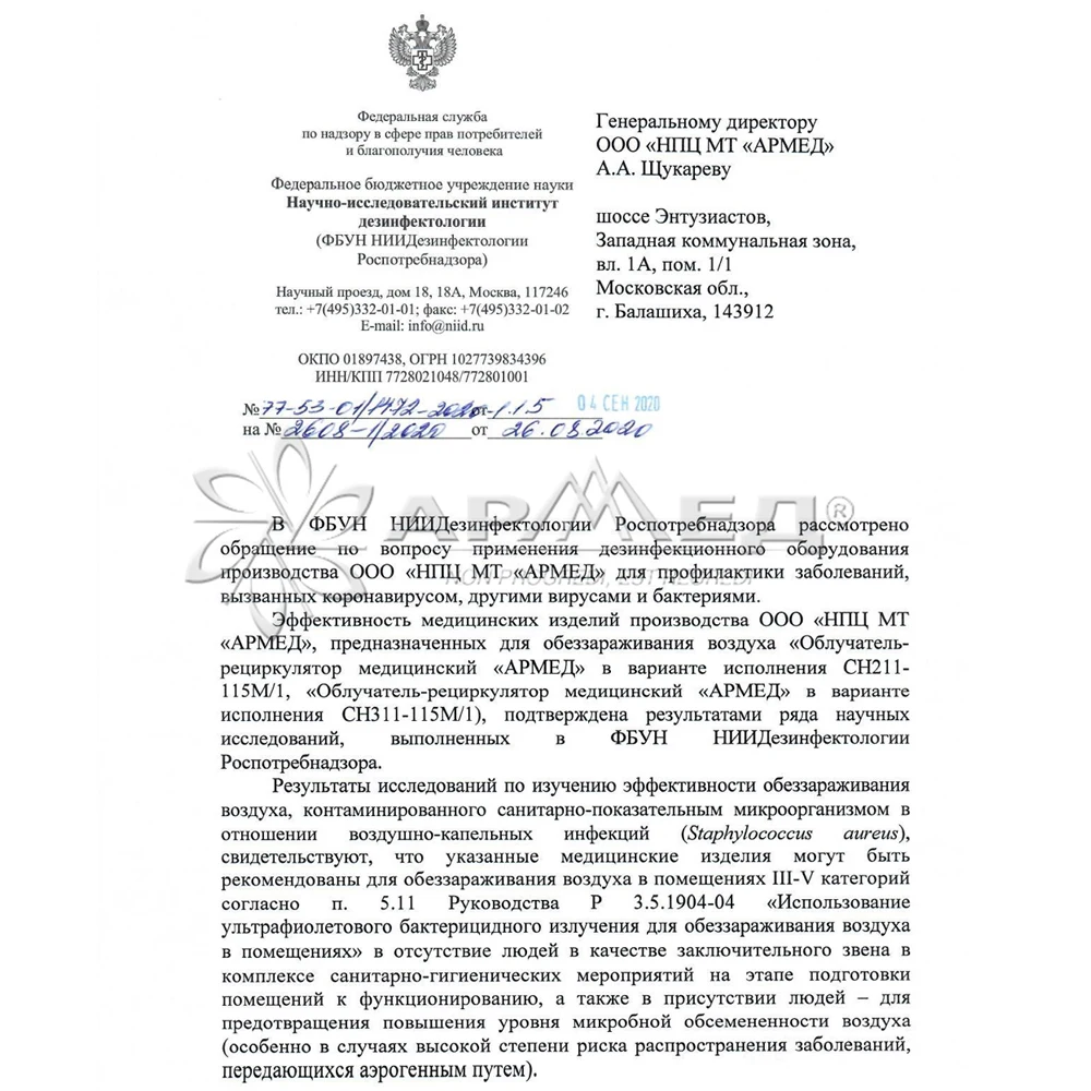 В результате ряда научных исследований ФБУН НИИ Дезинфектологии Роспотребнадзора была доказана эффективность рециркуляторов Армед. Устройства показали себя как надежный способ обеззараживания воздуха различных помещений в профилактических целях.