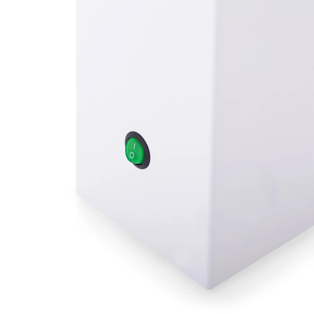 Вентиляционные решетки расположены на верхней и нижней панелях, обеспечивая свободное перемещение воздушного потока и защищая от прямых УФ-лучей. Пользоваться рециркулятором просто, достаточно нажать клавишу включения/выключения и прибор начнет работу.