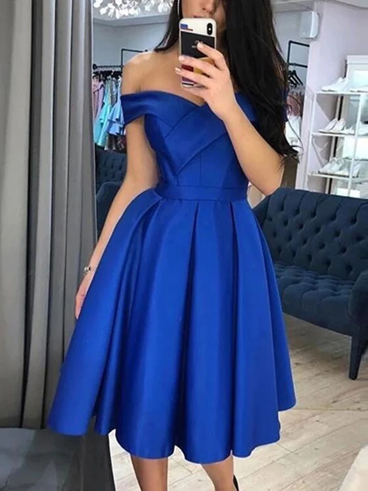 Элегантные короткие платья для встречи выпускников Королевского синего цвета атласные вечерние платья с открытыми плечами плиссированные трапециевидные платья до колен для выпускного вечера