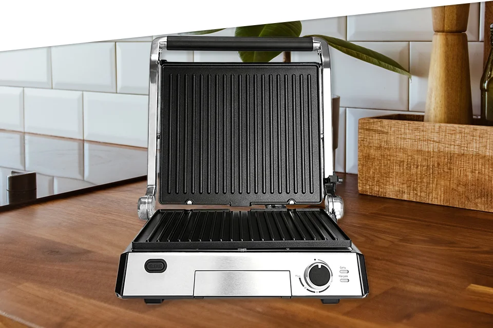 Гриль оснащен термостатом с плавной регулировкой, что позволяет установить температуру до 230 ° C.