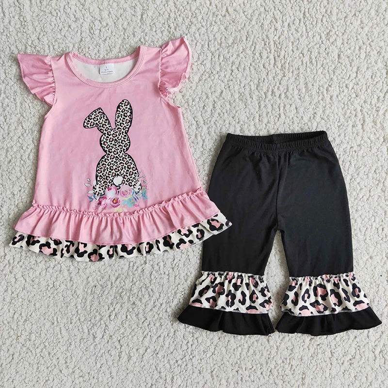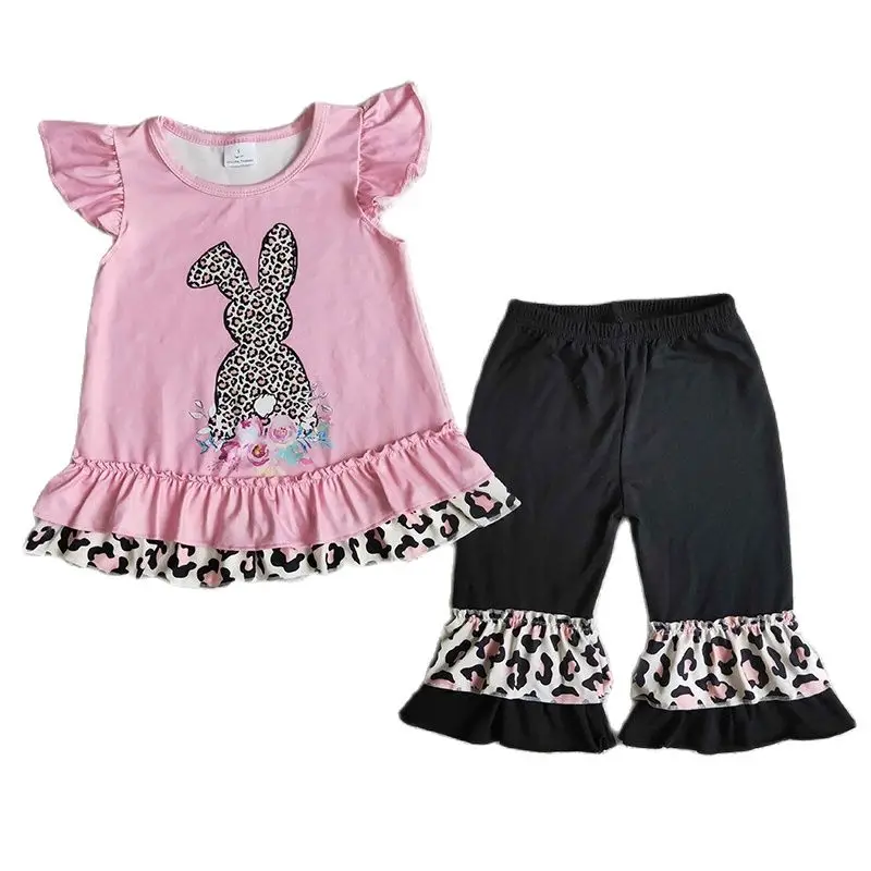 Оптовая продажа, Пасхальный кролик, модный детский весенний наряд с розовым леопардовым Кроликом, одежда для маленьких девочек, брюки с оборками, одежда для малышей