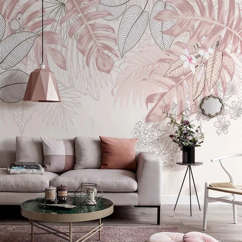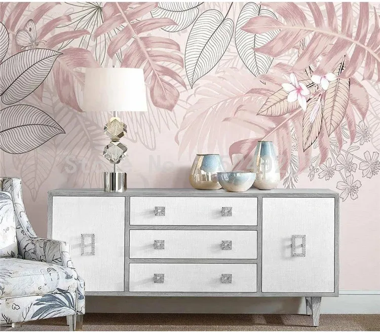 Фото обои скандинавские Ins розовые тропические растения ручная роспись листья Крытый фон настенная Гостиная ТВ Papel де Parede