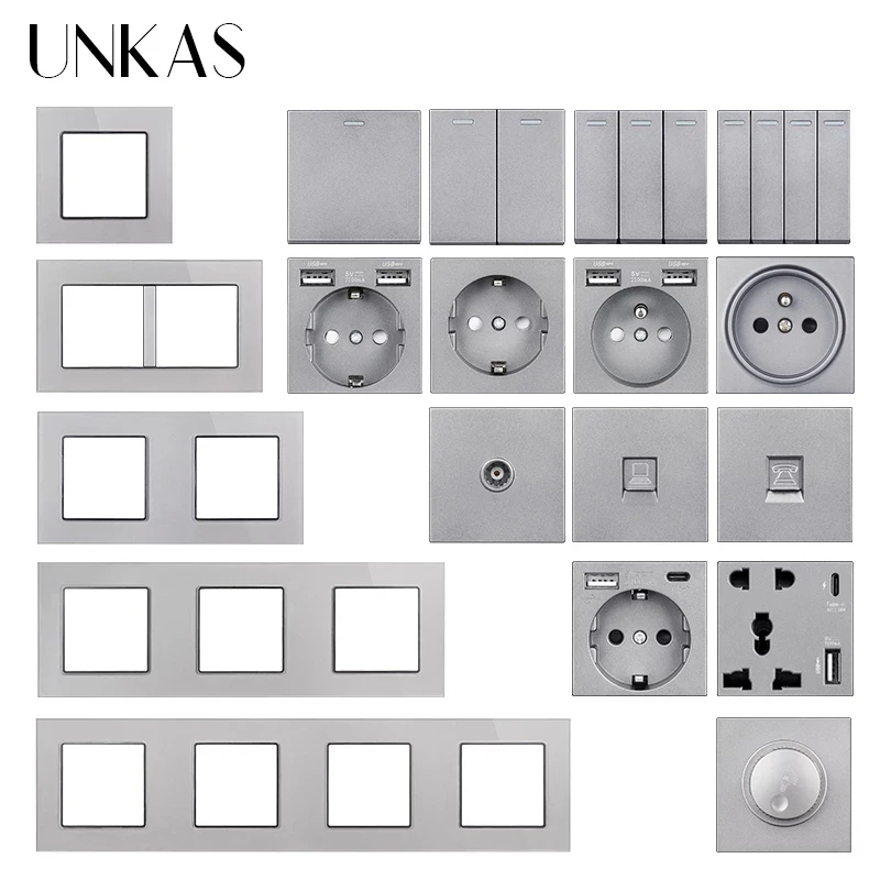 Серая стеклянная панель UNKAS «сделай сам», Бесплатная комбинация, французская розетка европейского стандарта, Тип C, двойной USB 1, 2, 3, 4, 1/2, переключатель кнопка включения/выключения