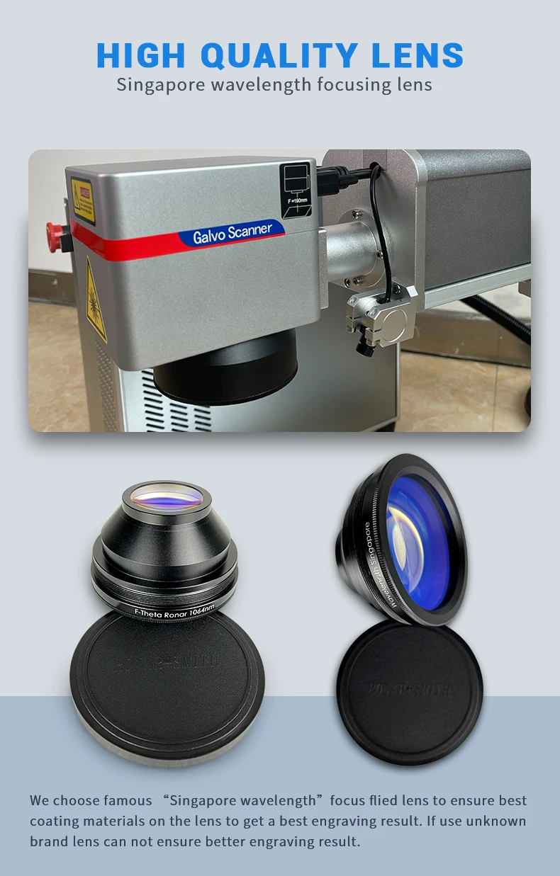 Мы выбираем знаменитые фокусированные линзы с длиной волны Сингапура, чтобы обеспечить наилучшие материалы покрытия линз для получения наилучшего результата гравировки. При использовании объектива неизвестного бренда гравировка не может быть улучшена.