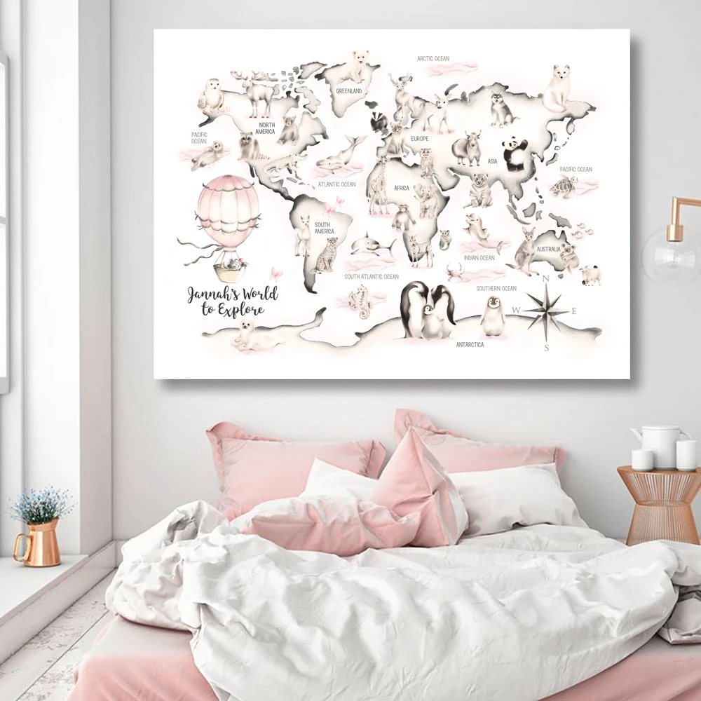 Картина на холсте с изображением лесных животных, постер, принты для детской комнаты, акварельная карта с именем на заказ, настенная живопись для детской комнаты